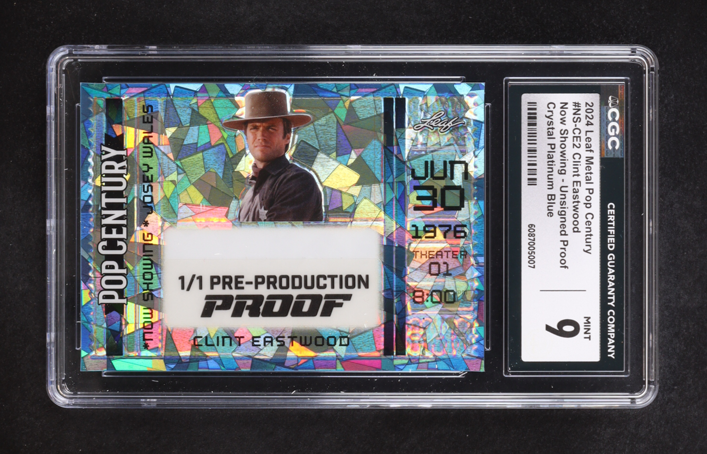 Clint Eastwood 2024 Leaf Metal Pop Century Now Showing Unsigned Crystal Platinum Blue Pre-Production Proof #NS-CE2 #1/1 (CGC 9)