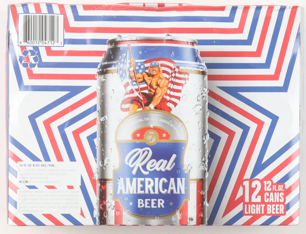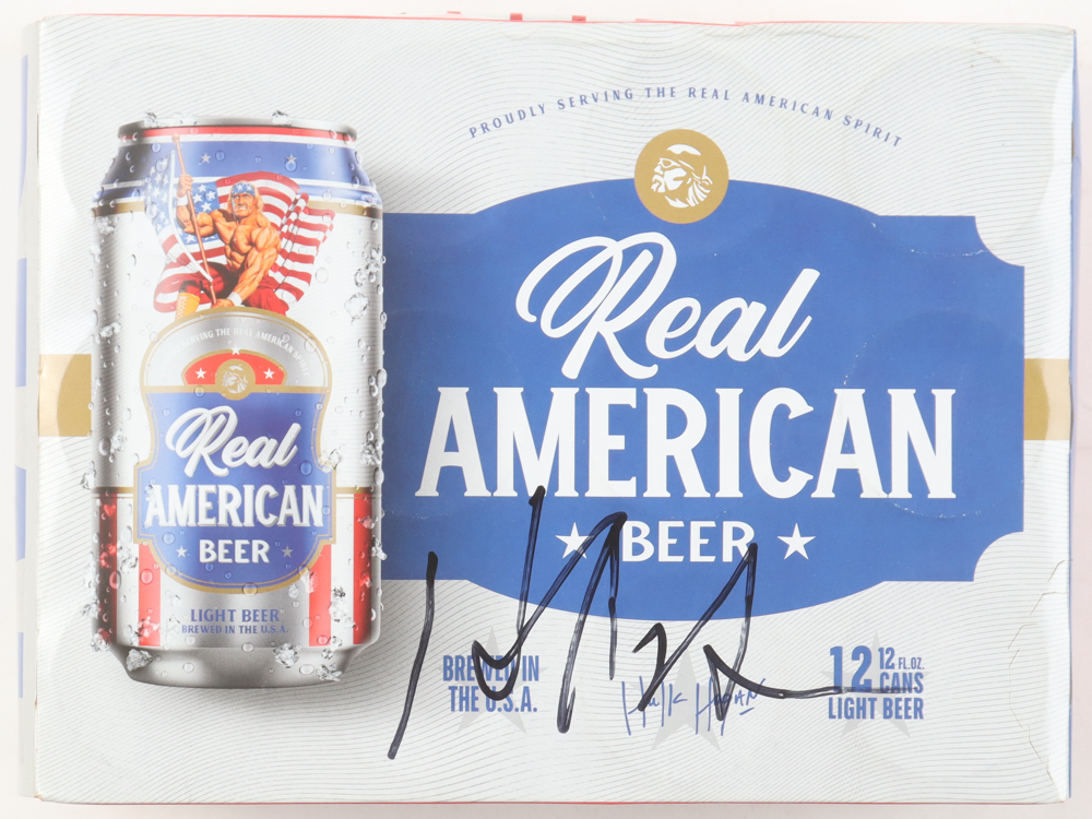 Real American Beer box measures 10" x 8" x 5" and has been hand-signed by Hulk Hogan (HOF). Please note box does come with the cans but they are empty, see photos for more details on condition of the box.