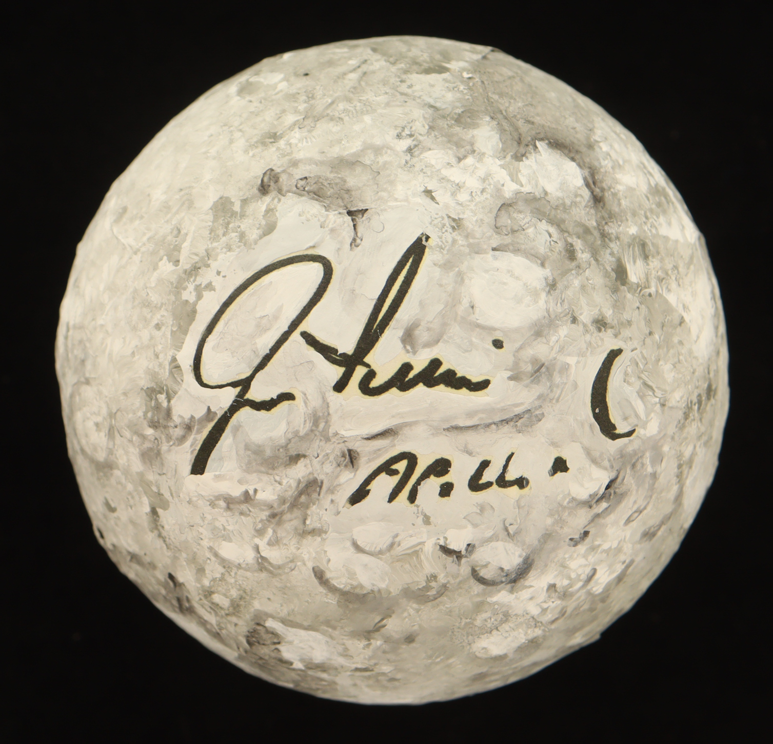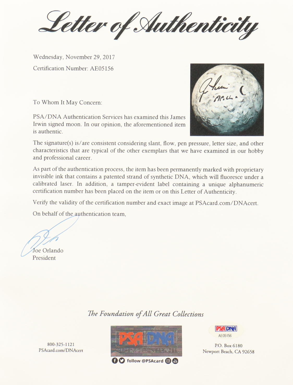 """Embark on a celestial journey with this extraordinary auction offering! Available for bidding is a signed hand-painted replica of the Moon, accompanied by a display case, authenticated by PSA/DNA authentication services. This remarkable piece of memorabilia comes from the personal collection of Apollo moonwalker James Irwin, adding a unique and prestigious touch to any space enthusiast's collection.