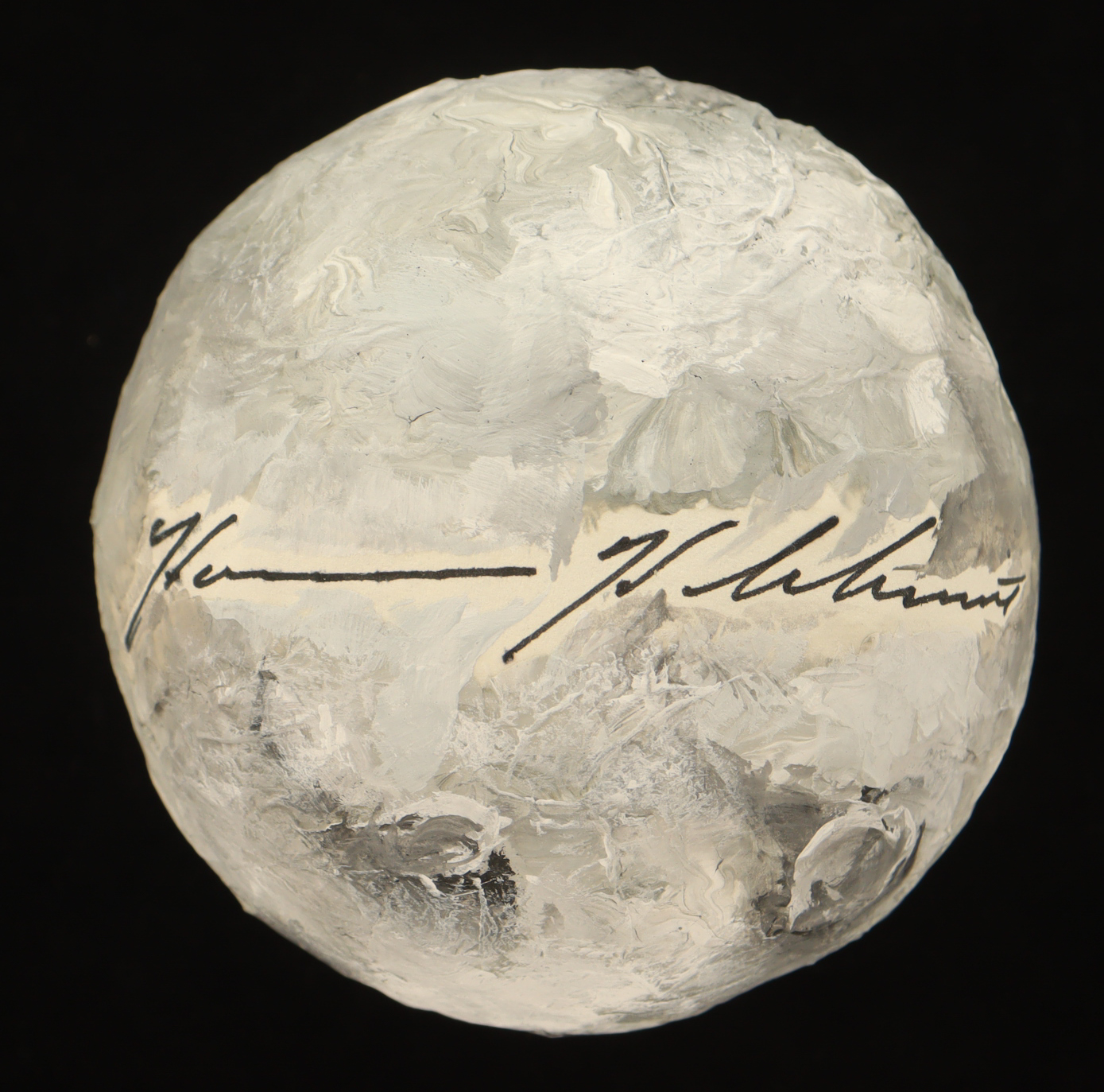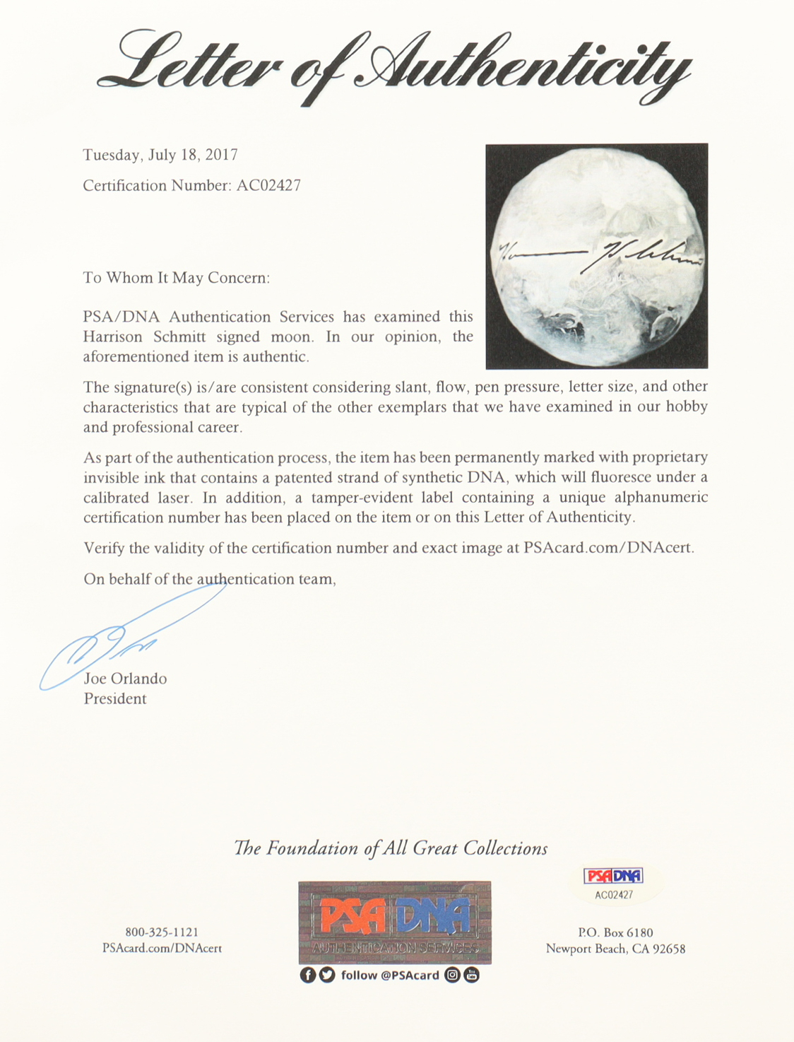 Replica moon has been hand-signed and inscribed by Harrison Schmitt. Display case is included, as shown.