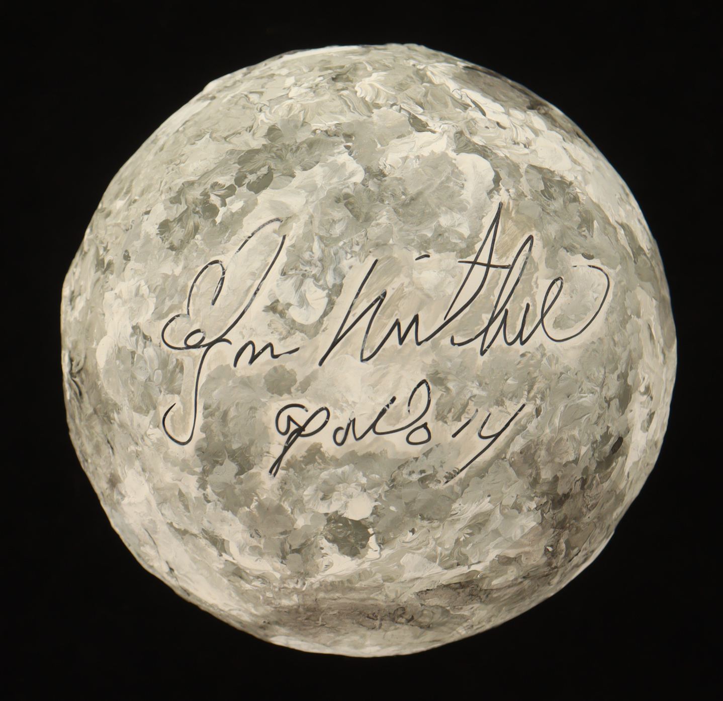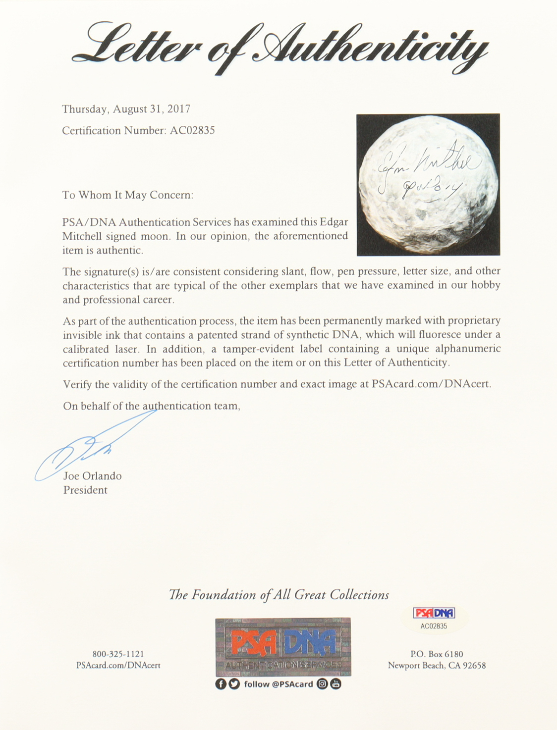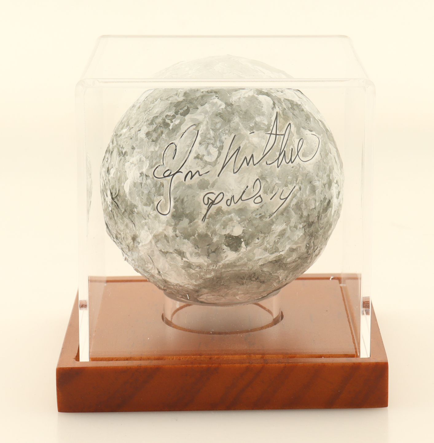 Replica moon has been hand-signed and inscribed by Edgar Mitchell (D. 2016). Display case is included, as shown.