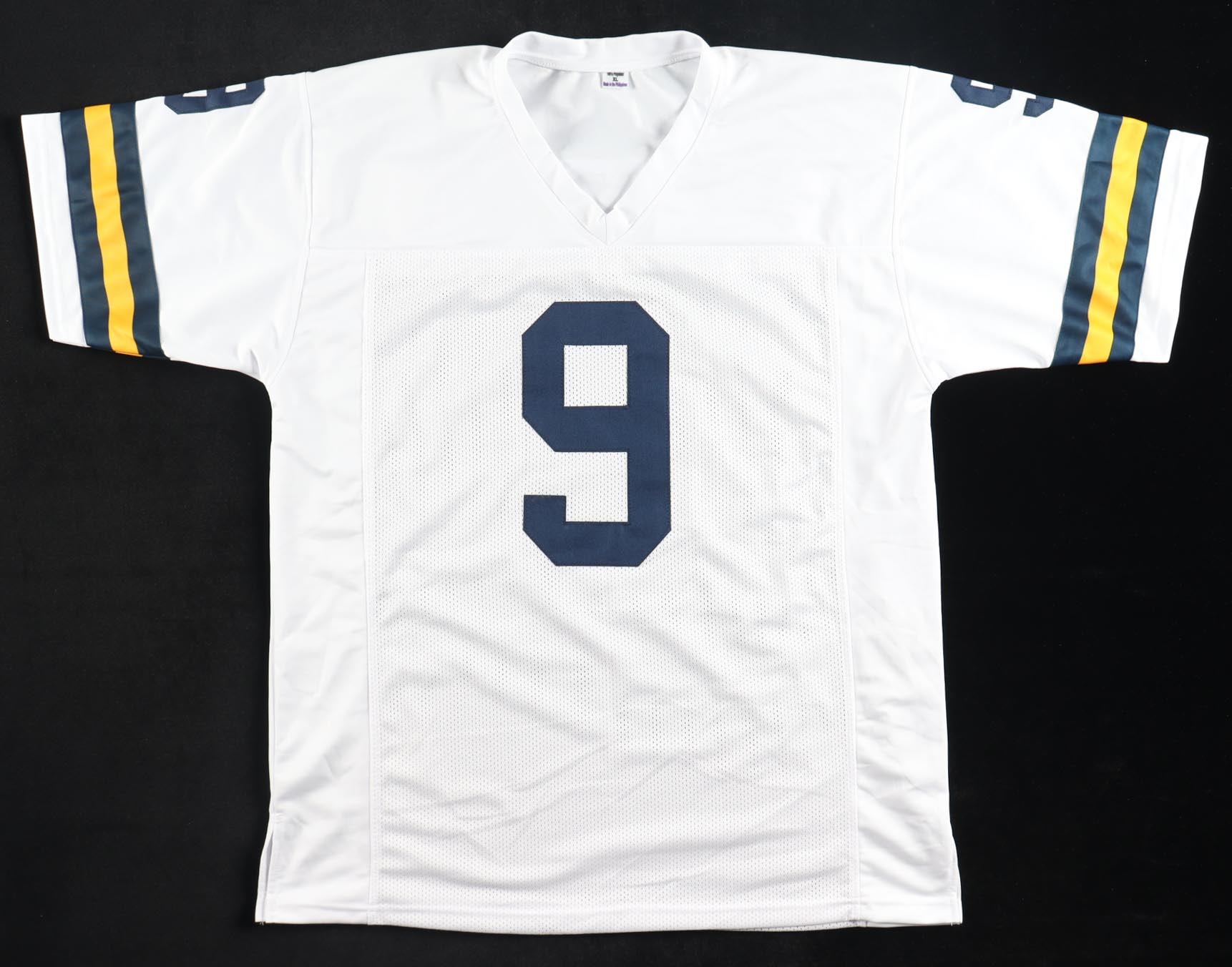 Custom jersey with everything sewn on, size XL. Hand-signed by J. J. McCarthy.