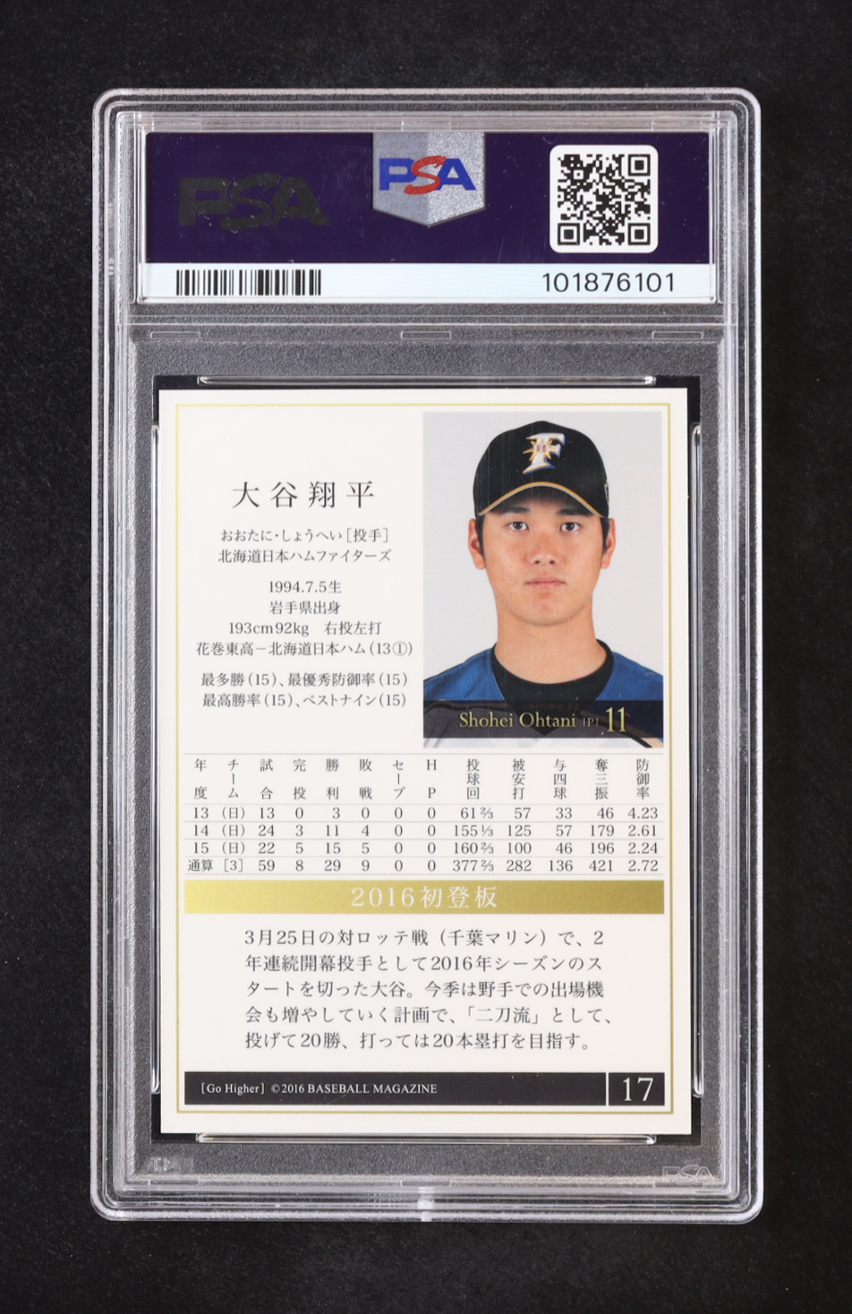 Shohei Ohtani 2016 BBM Ohtani & Fujinami Go Higher #17 RC (PSA 10)