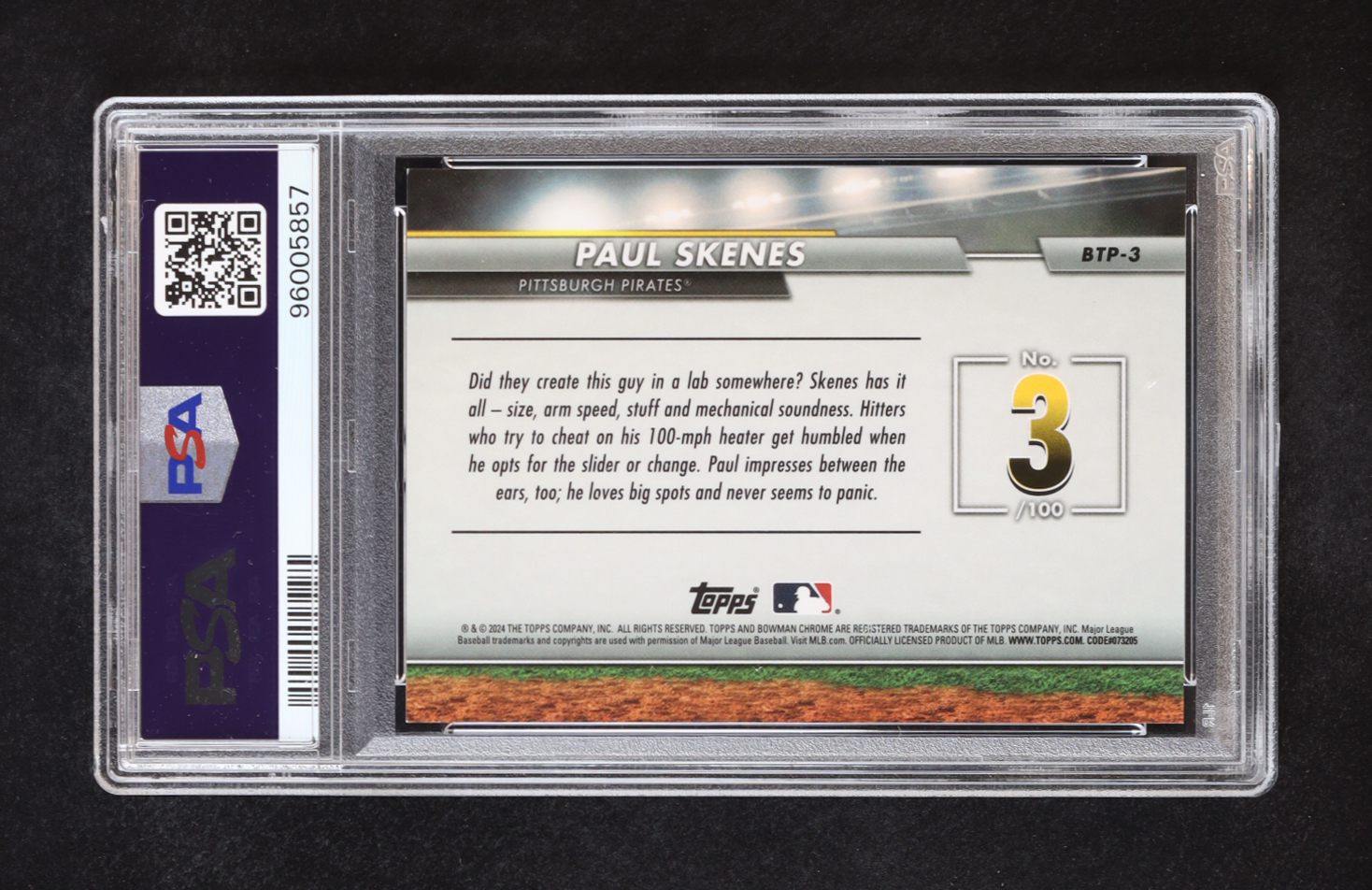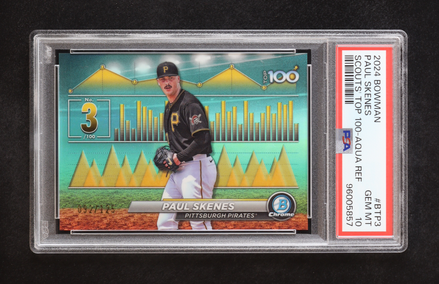 Paul Skenes 2024 Bowman Chrome Scouts Top 100 Aqua Refractors #BTP3 RC #092/125 (PSA 10)