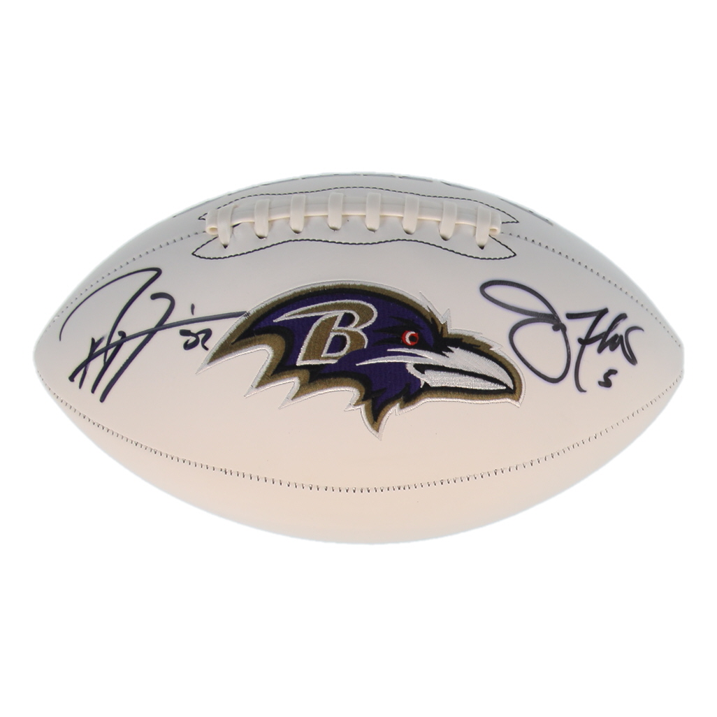 Baltimore Ravens logo football. Hand-signed by Ray Lewis (HOF) and Joe Flacco. Please note the smudged signatures.
