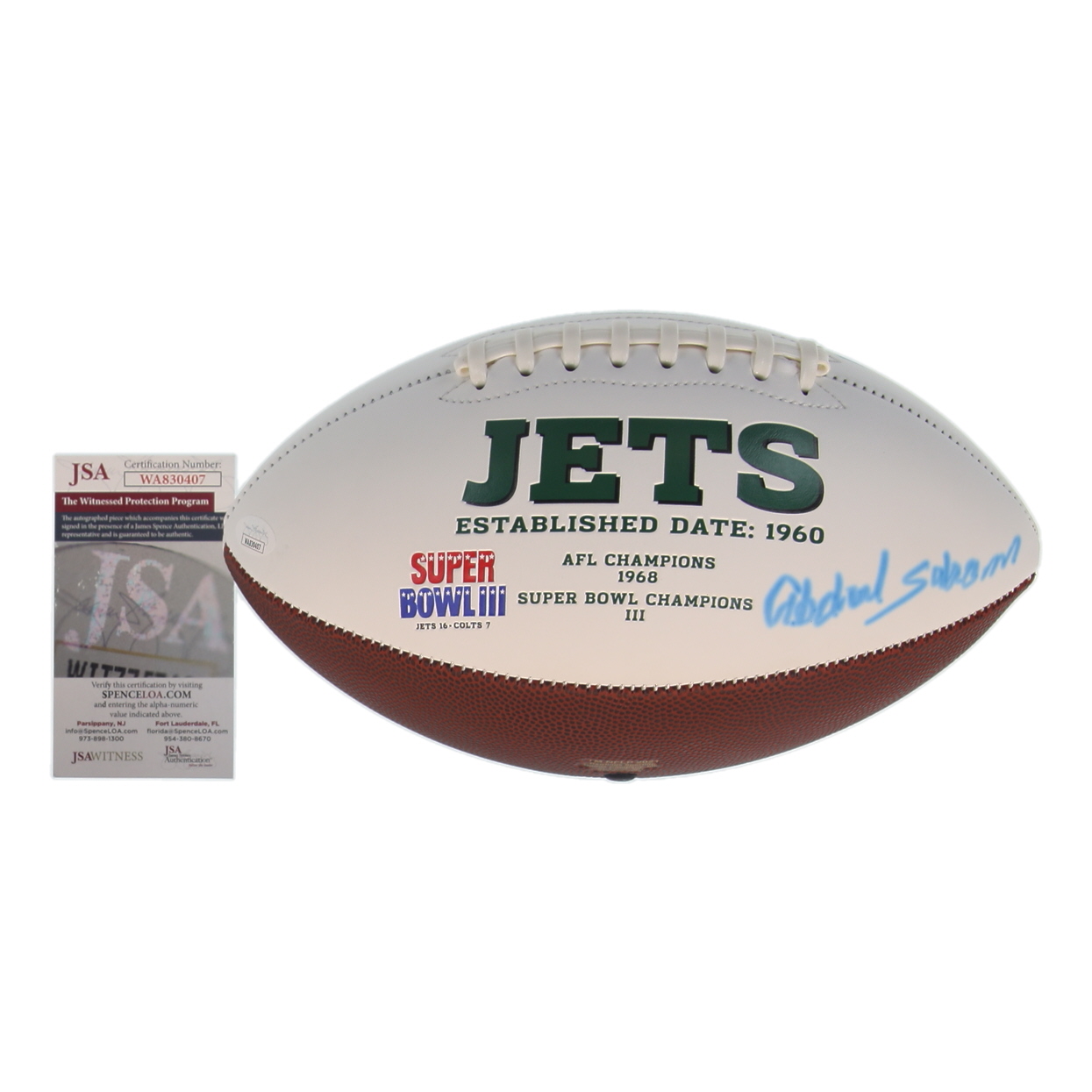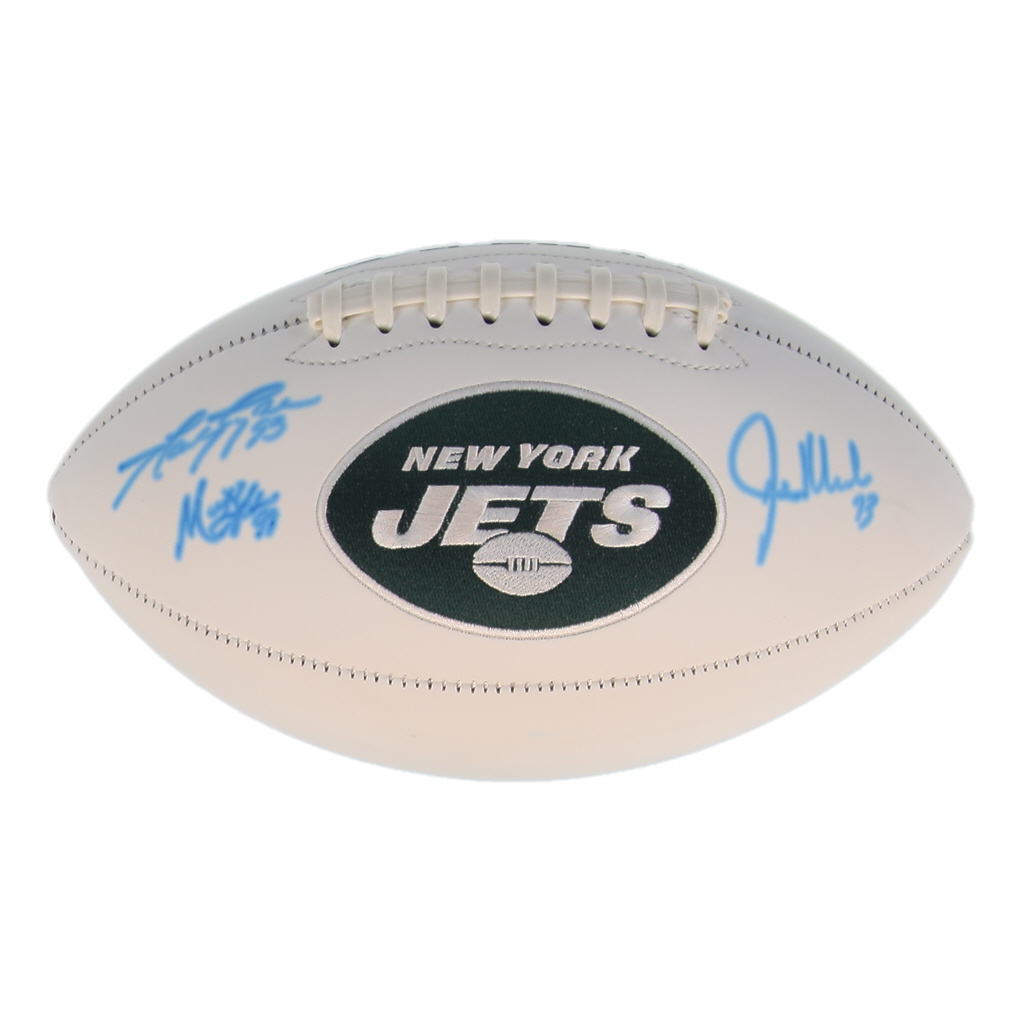 New York Jets logo football has been hand-signed by Joe Klecko (HOF), Mark Gastineau, Marty Lyons (HOF), and Abdul Salaam (D. 2024).
