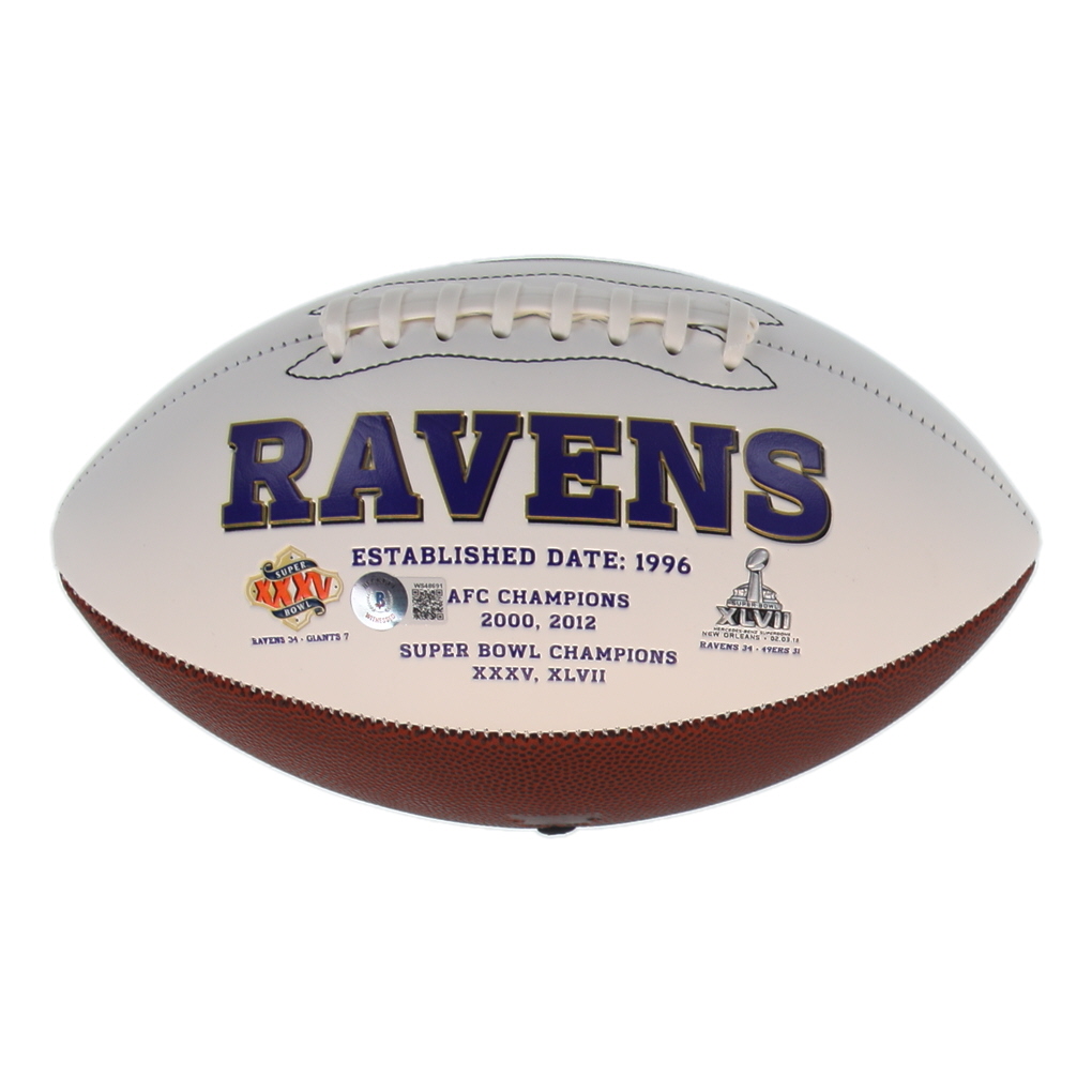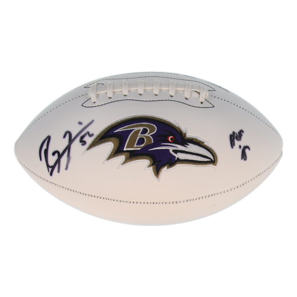 Baltimore Ravens logo football. Hand-signed and inscribed by Ray Lewis (HOF).