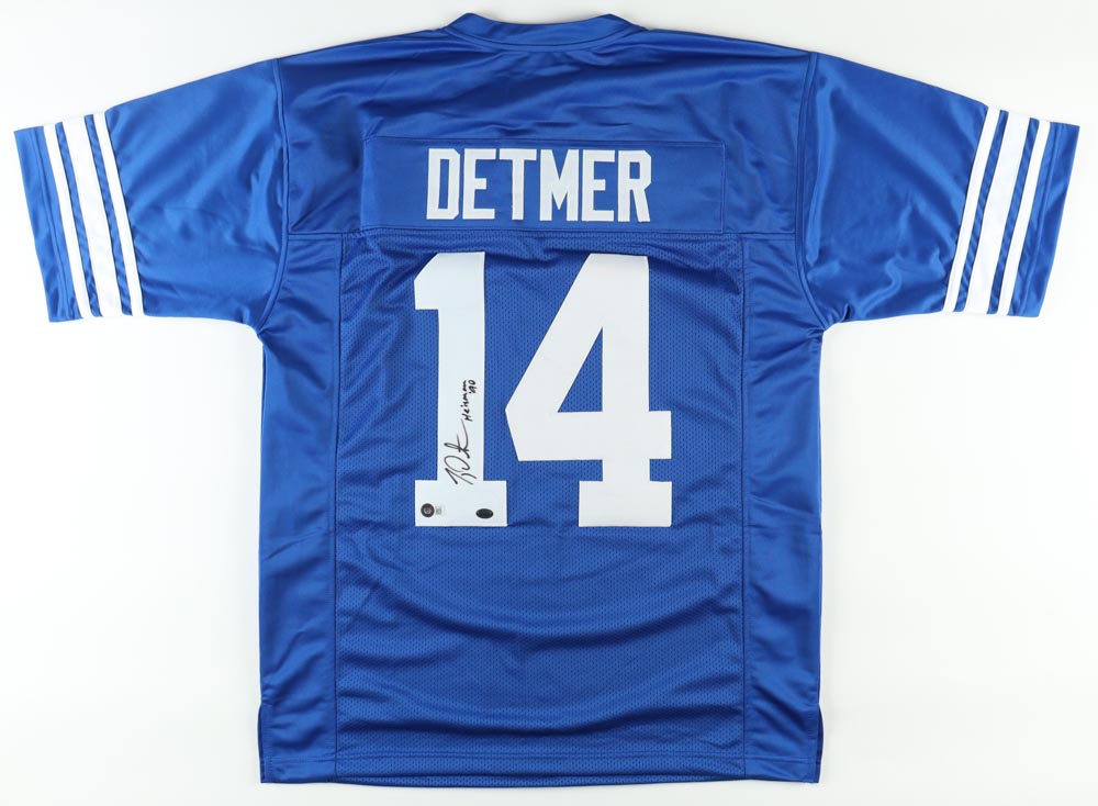 Custom jersey with everything sewn on, size XL. Hand-signed and inscribed by Ty Detmer.
