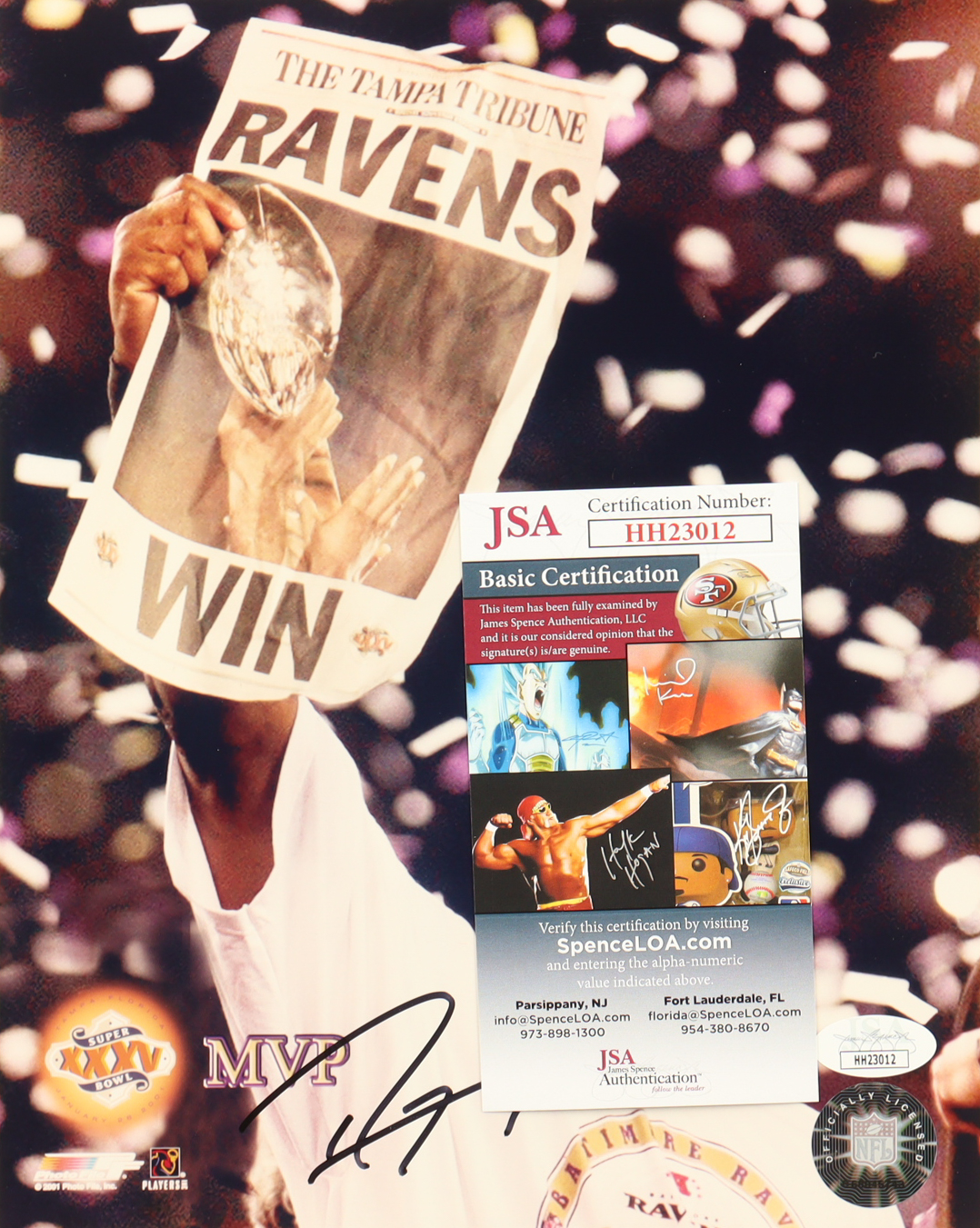 Photo measures 8" x 10" in size and has been hand-signed by Ray Lewis (Baltimore Ravens, HOF).