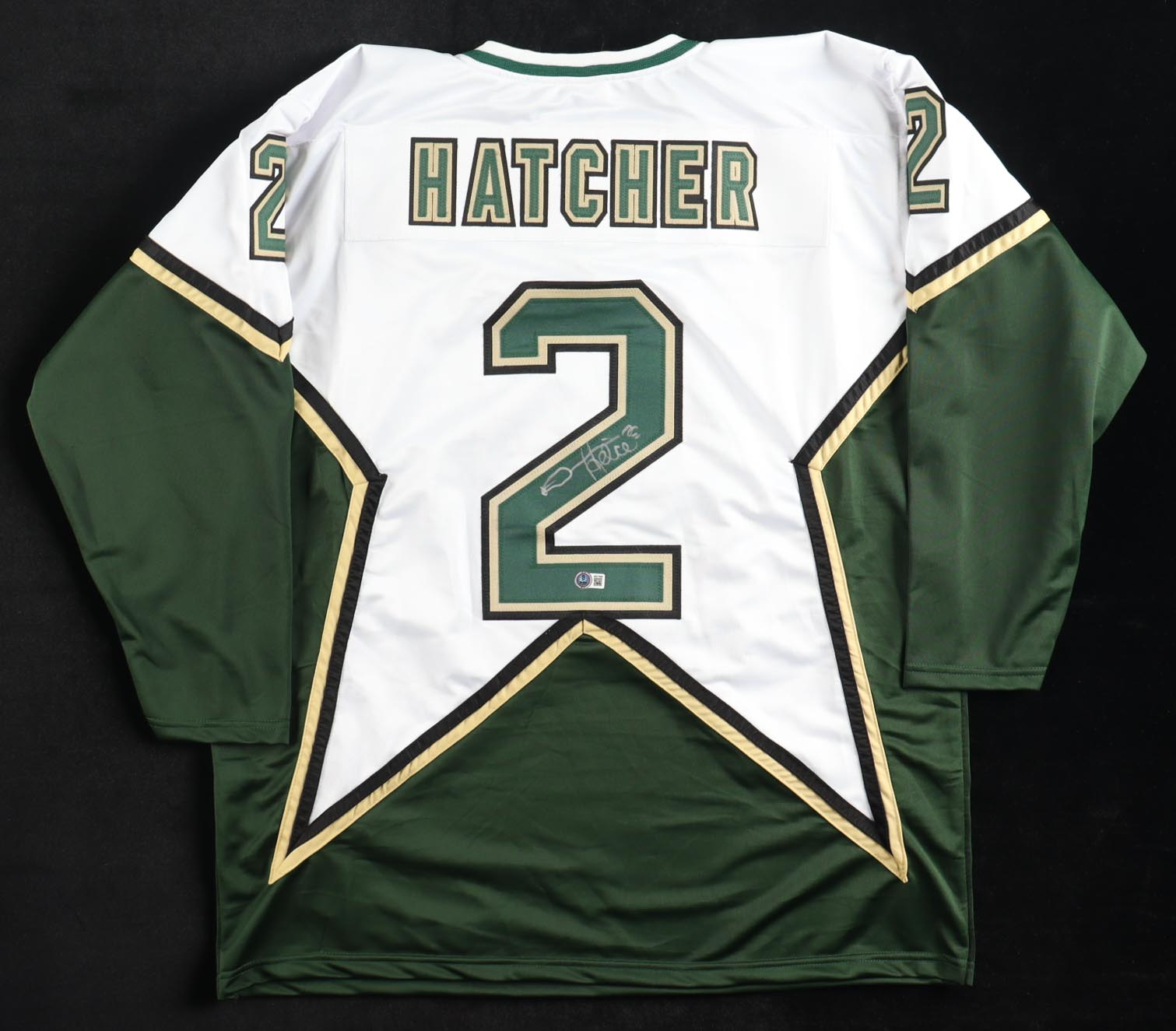 Custom jersey. Everything is sewn on, size XL. Hand-signed by Derian Hatcher.