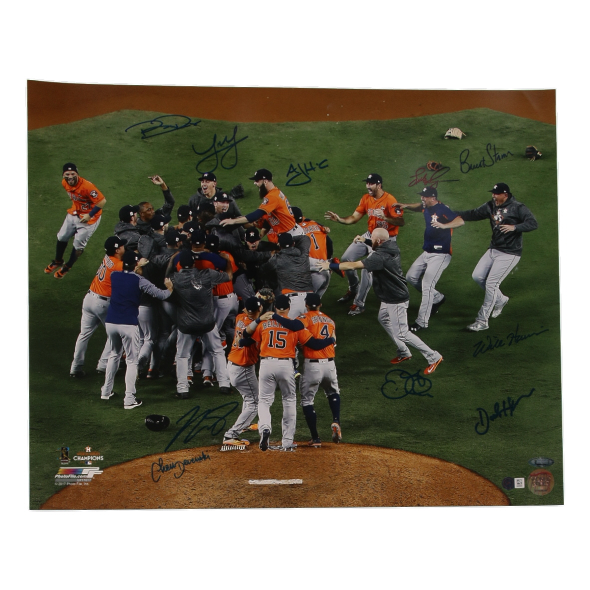 Photo measures 16” x 20” in size and has been hand-signed by (10) members of the 2017 World Series Champions Houston Astros team. Signers include A.J. Hinch, Chris Devenski, Derek Fisher, Luke Gregerson, Will Harris, Tony Kemp, Joe Musgrove, Brad Peacock, Dave Hudgens and Brent Strom.