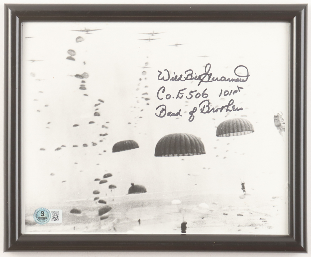 Custom frame measures 9" x 11" in size and features a photo that has been hand-signed and inscribed by William Guarnere (D. 2014).