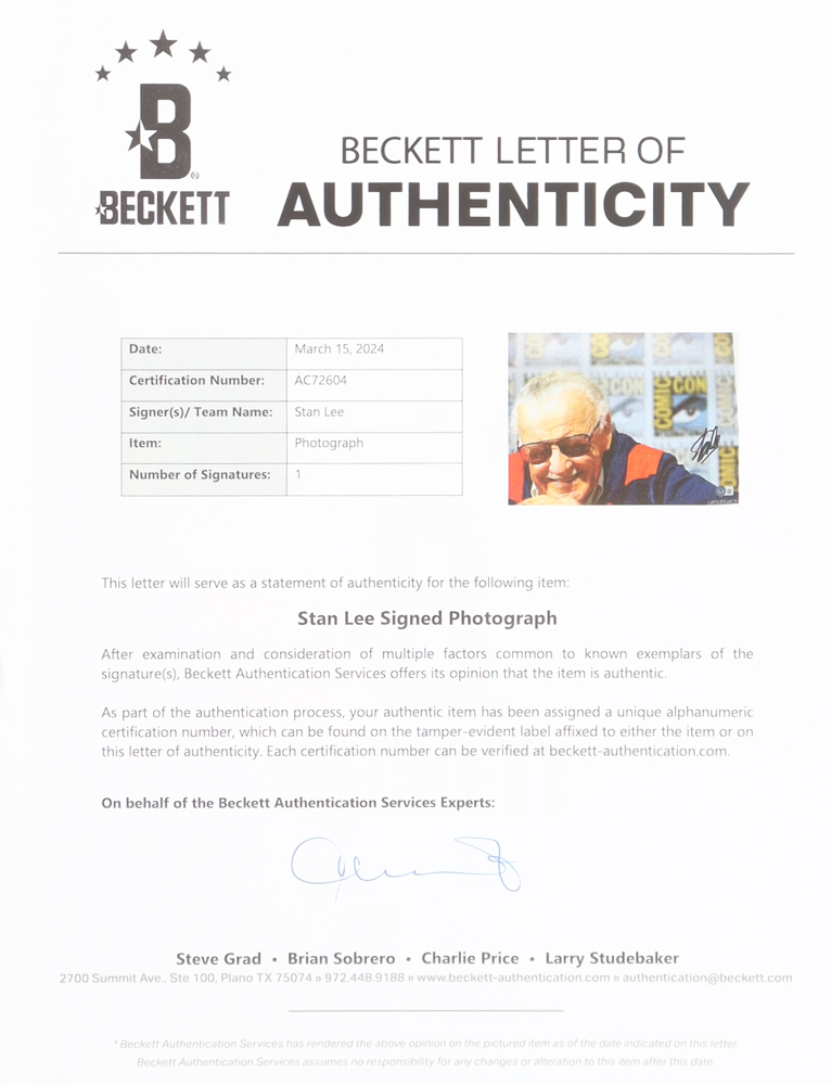 Custom frame measures approximately 12" x 18" in size and features a photo that has been hand-signed by Stan Lee (D. 2018).