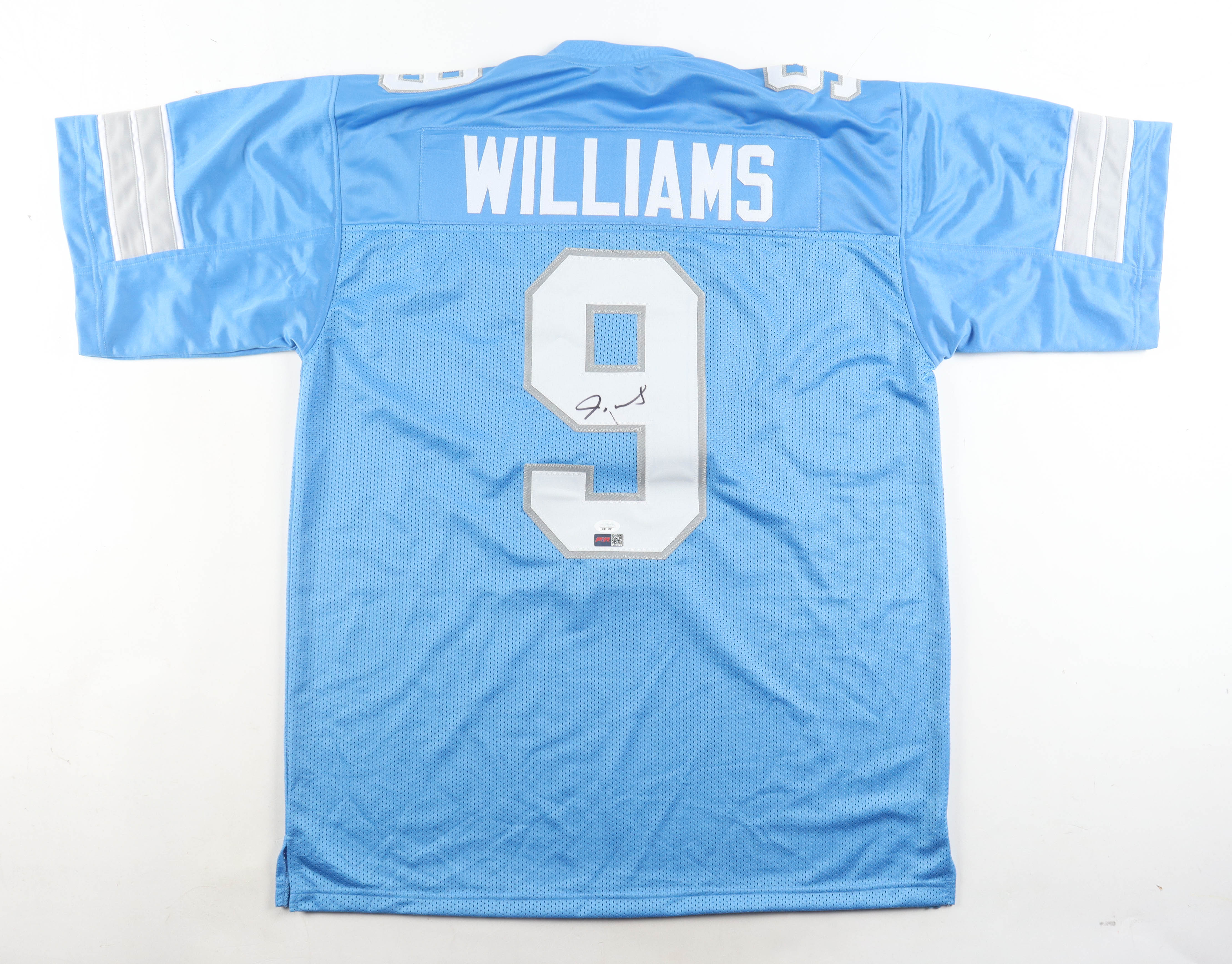 Custom jersey with everything sewn on, size XL. Hand-signed by Jameson Williams (Detroit Lions). Please note, there is a stray pen mark below the signature.