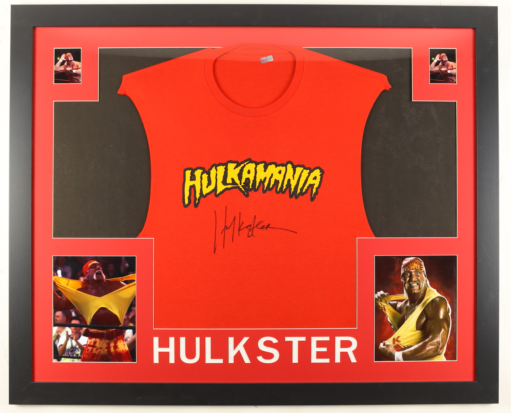 Custom framed display measures approximately 34" x 42" in size and features a "Hulkamania" T-Shirt that has been hand-signed by Hulk Hogan (HOF).