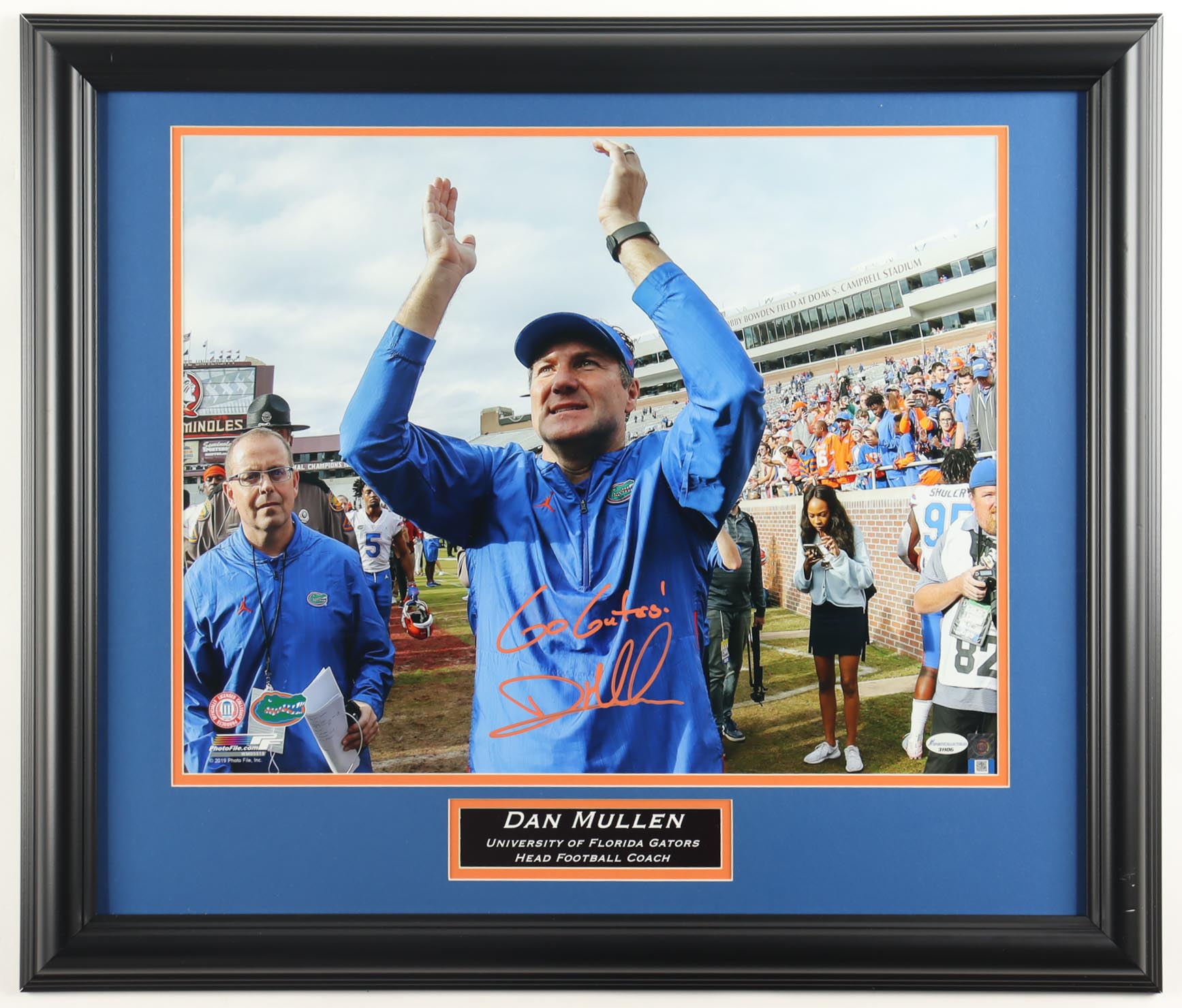 Custom frame measures approximately 23.5" x 27.5" in size and features a photo that has been hand-signed and inscribed by Dan Mullen (Florida Gators Coach). Please note, there is scuffing throughout the frame.