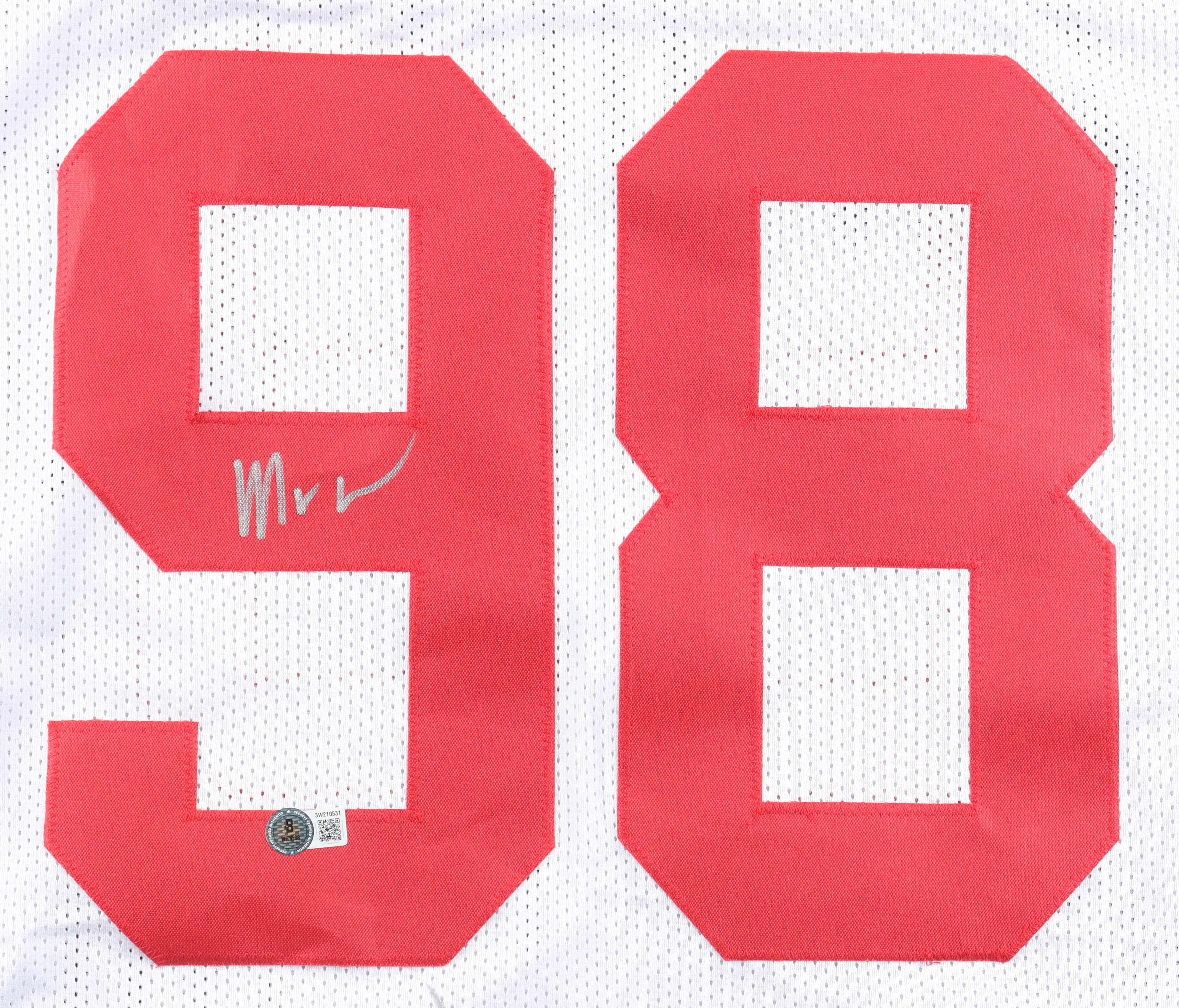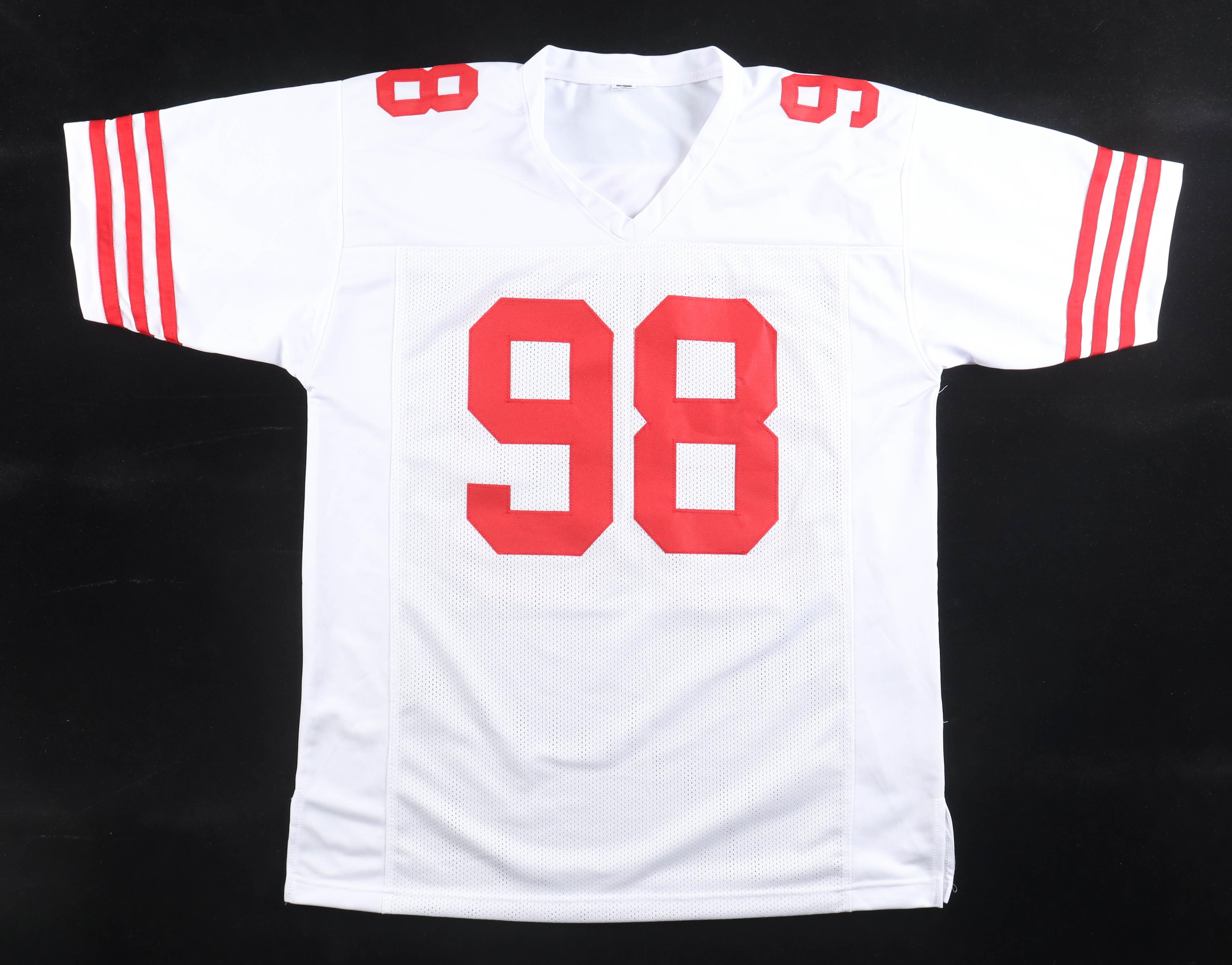 Custom jersey with everything sewn on, size XL. Hand-signed by Mykel Williams (San Francisco 49ers). Please note, there is a stray pen mark below the reverse numbers.