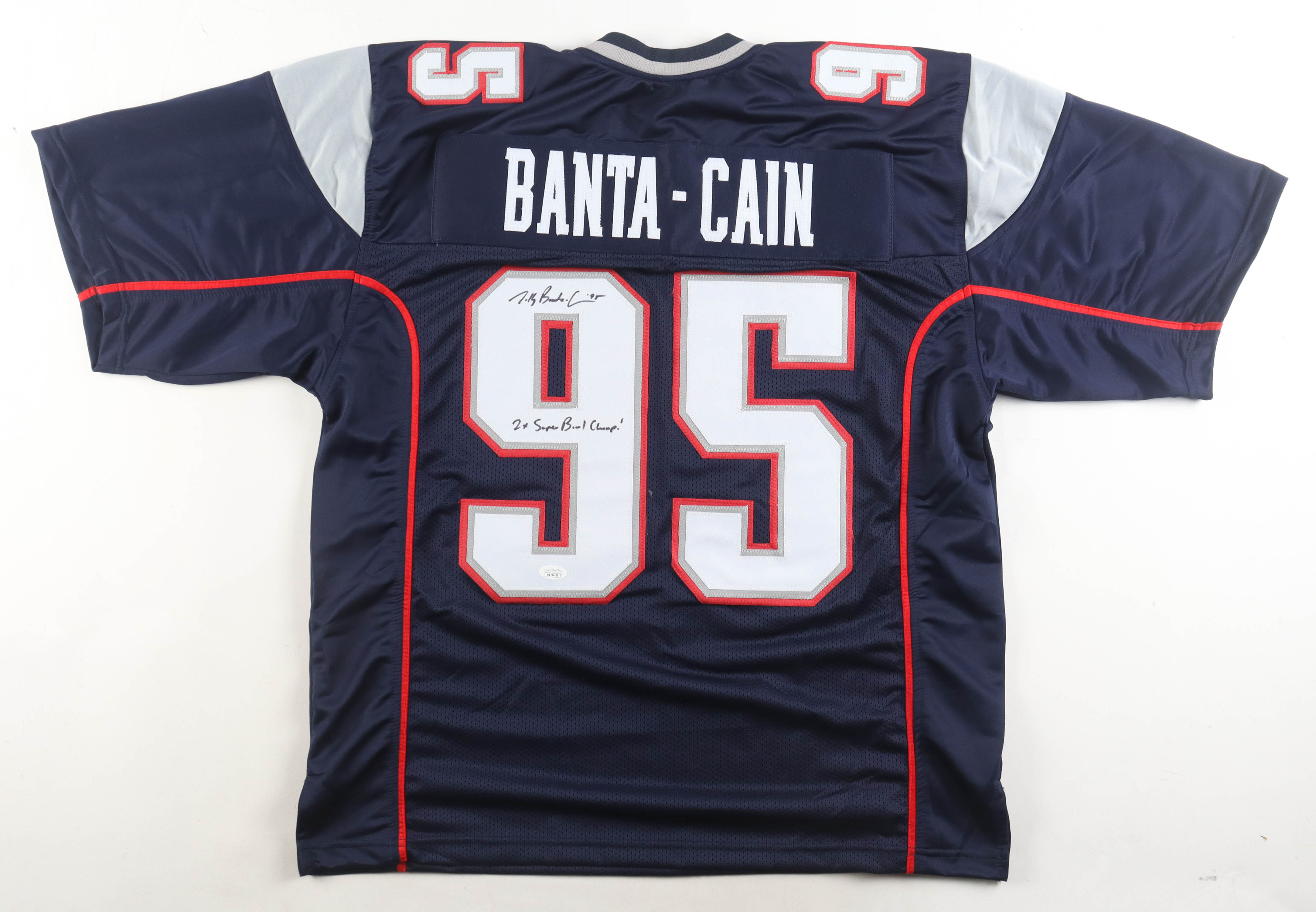 Custom jersey with everything sewn on, size XL. Hand-signed and inscribed by Tully Banta-Cain (New England Patriots).
