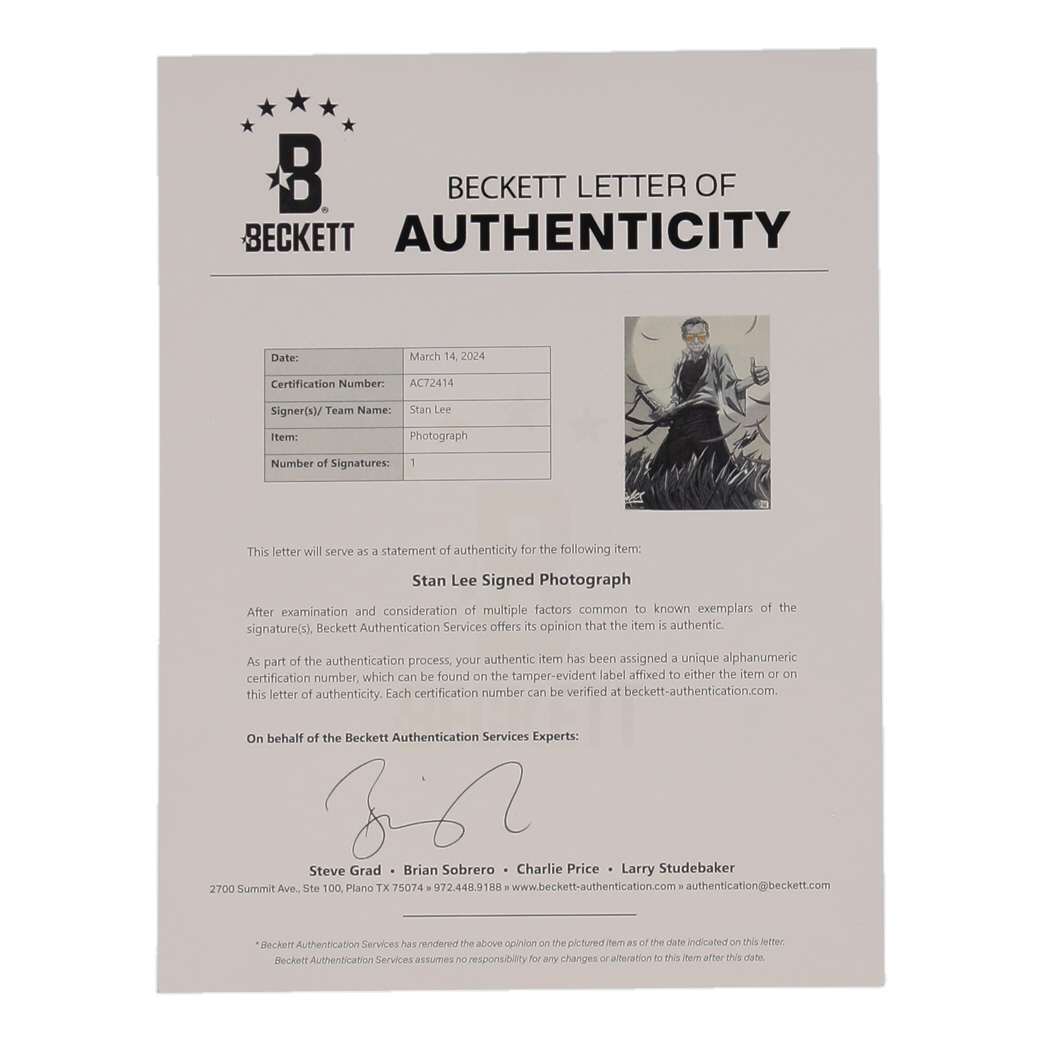 Photo measures 13" x 19" in size and has been hand-signed by Stan Lee (D. 2018).