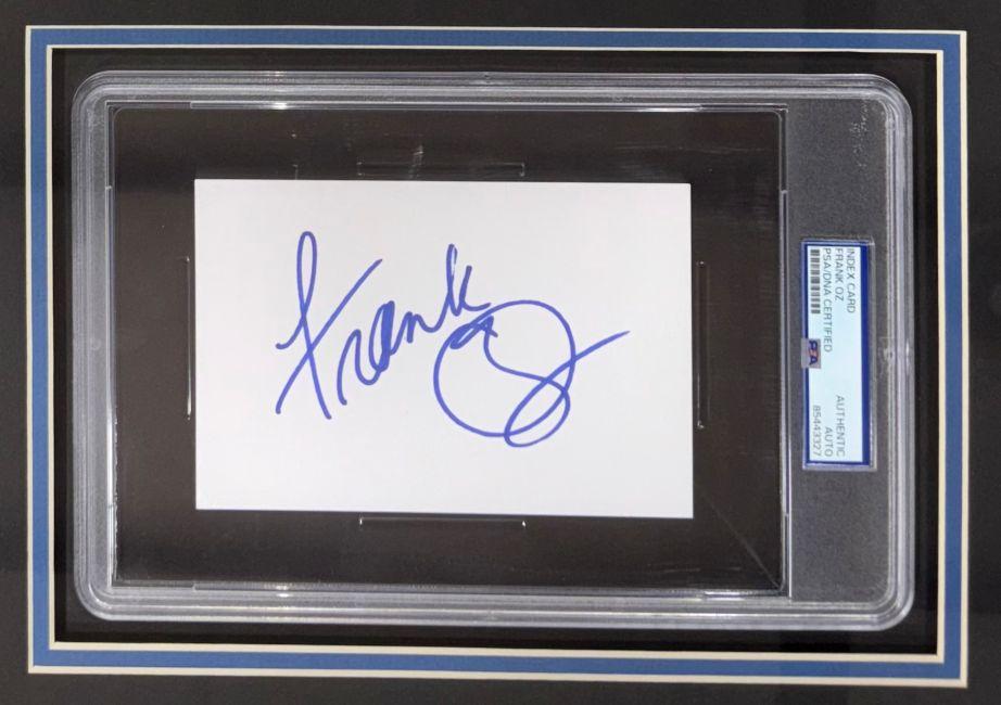 Custom frame measures 21” x 28” in size and features an index card that has been hand-signed by Frank Oz.