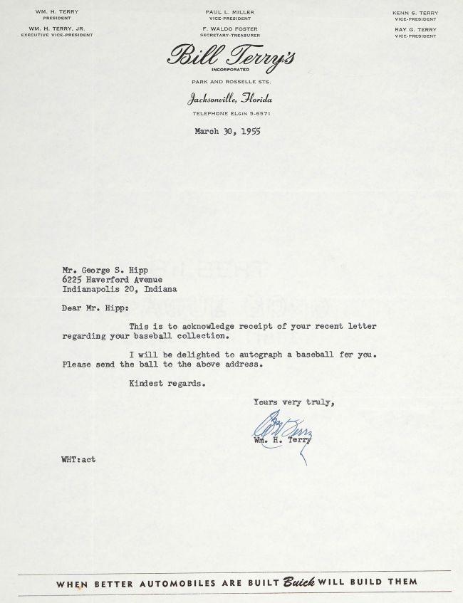 Baseball has been hand-signed and inscribed by Bill Terry (D. 1989, New York Giants, HOF).