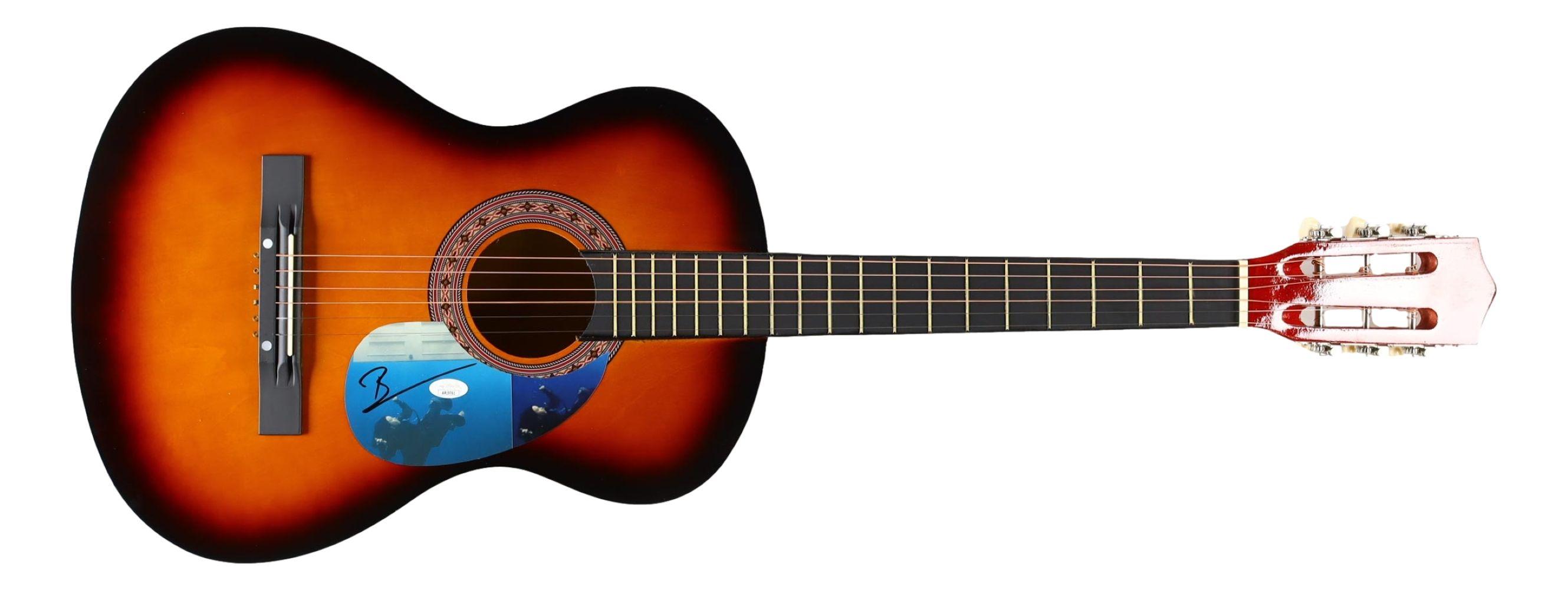 Billie Eilish acoustic guitar measures approximately 38" in length and has been hand-signed on the CD cover, repurposed as a pickguard, by Billie Eilish.