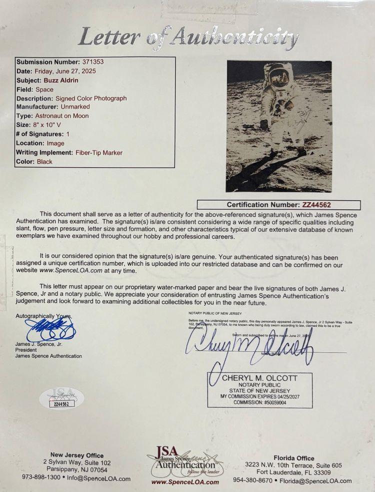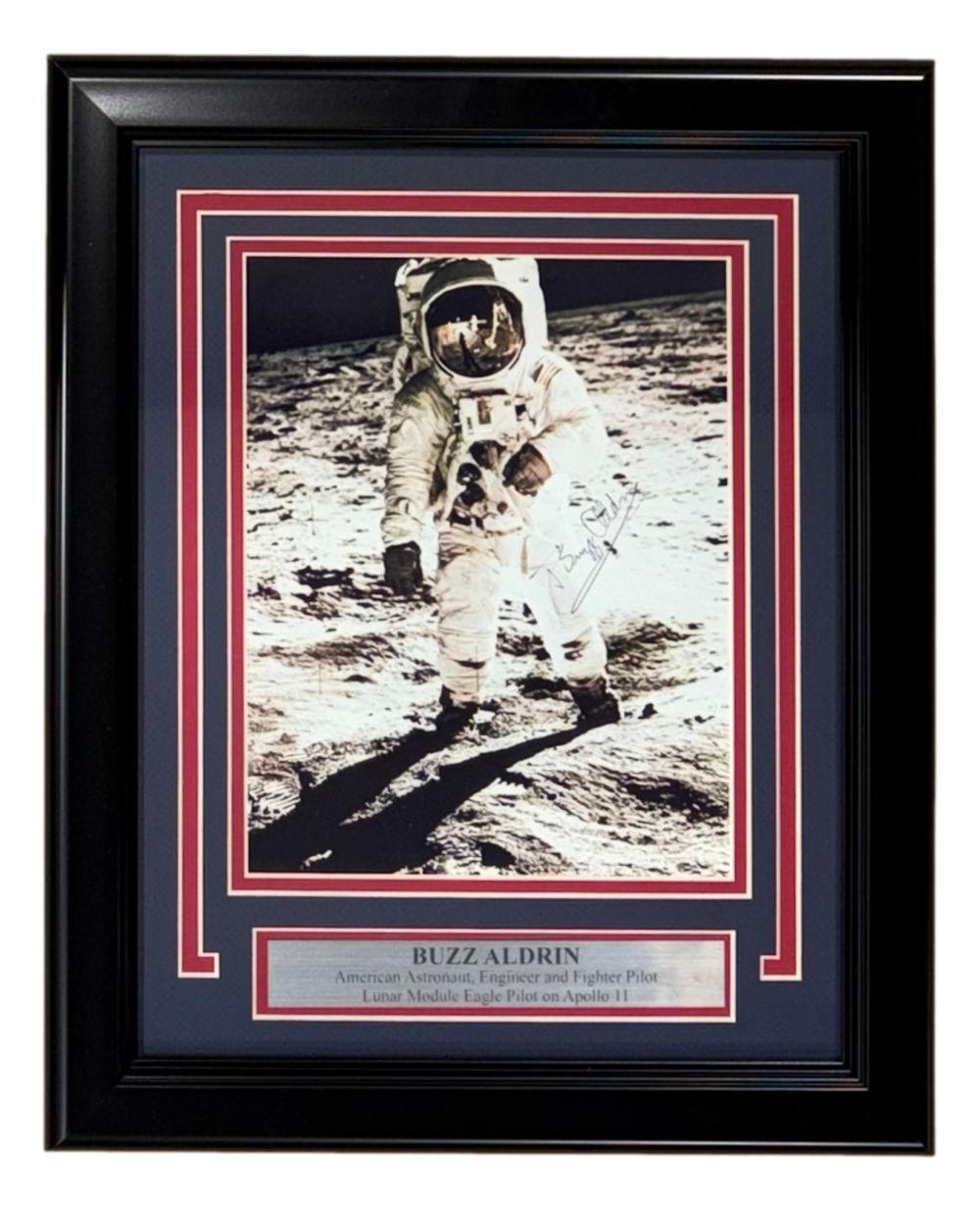Custom frame measures 11” x 14” in size and features a photo that has been hand-signed by Buzz Aldrin.