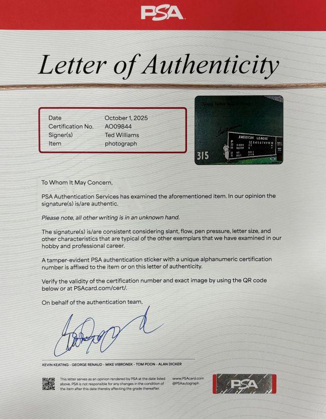 Custom frame measures 22” x 27” in size and features a photo that has been hand-signed by Ted Williams (D. 2002, Boston Red Sox, HOF).