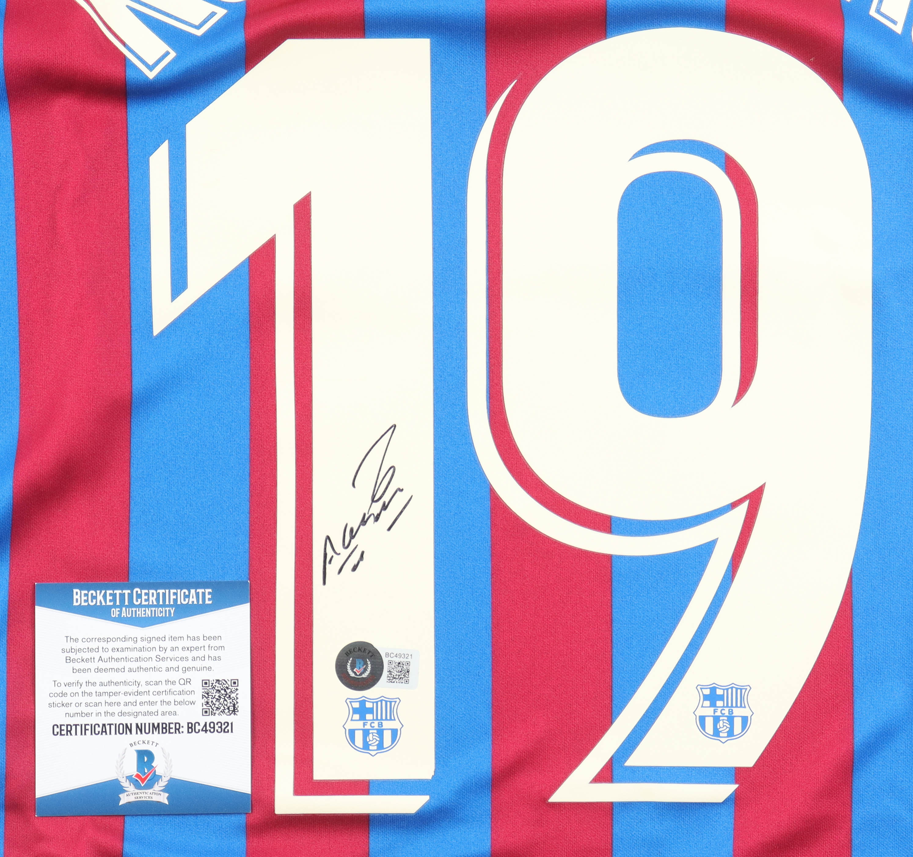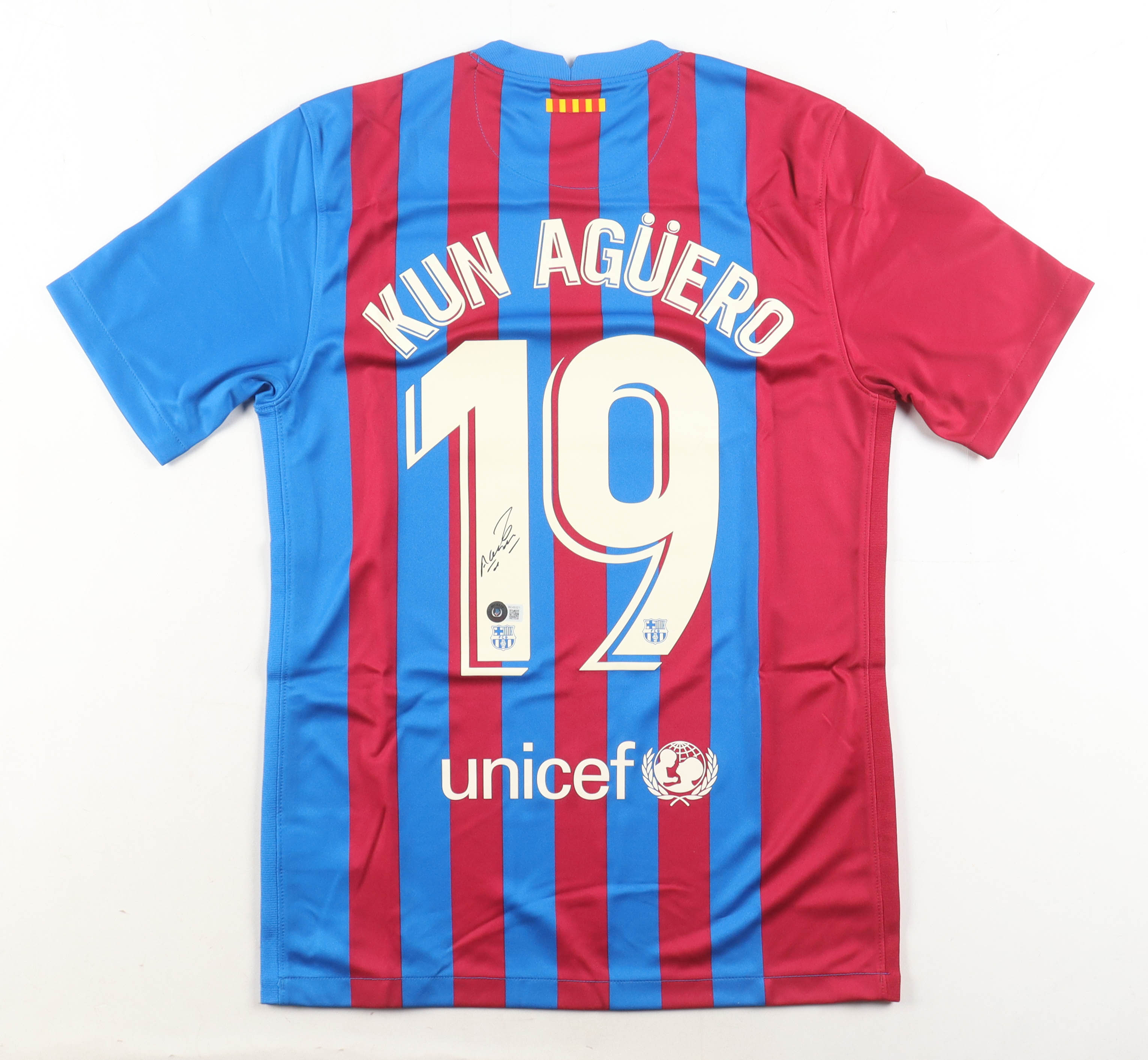 Nike authentic jersey with everything pressed on, size S. Hand-signed by Sergio Aguero (Futbol Club Barcelona).