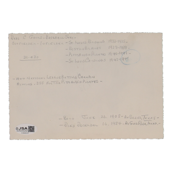 Photo measures 5" x 7" in size and has been hand-signed by Debs Garms (D. 1984, St. Louis Cardinals). See photos for more details.