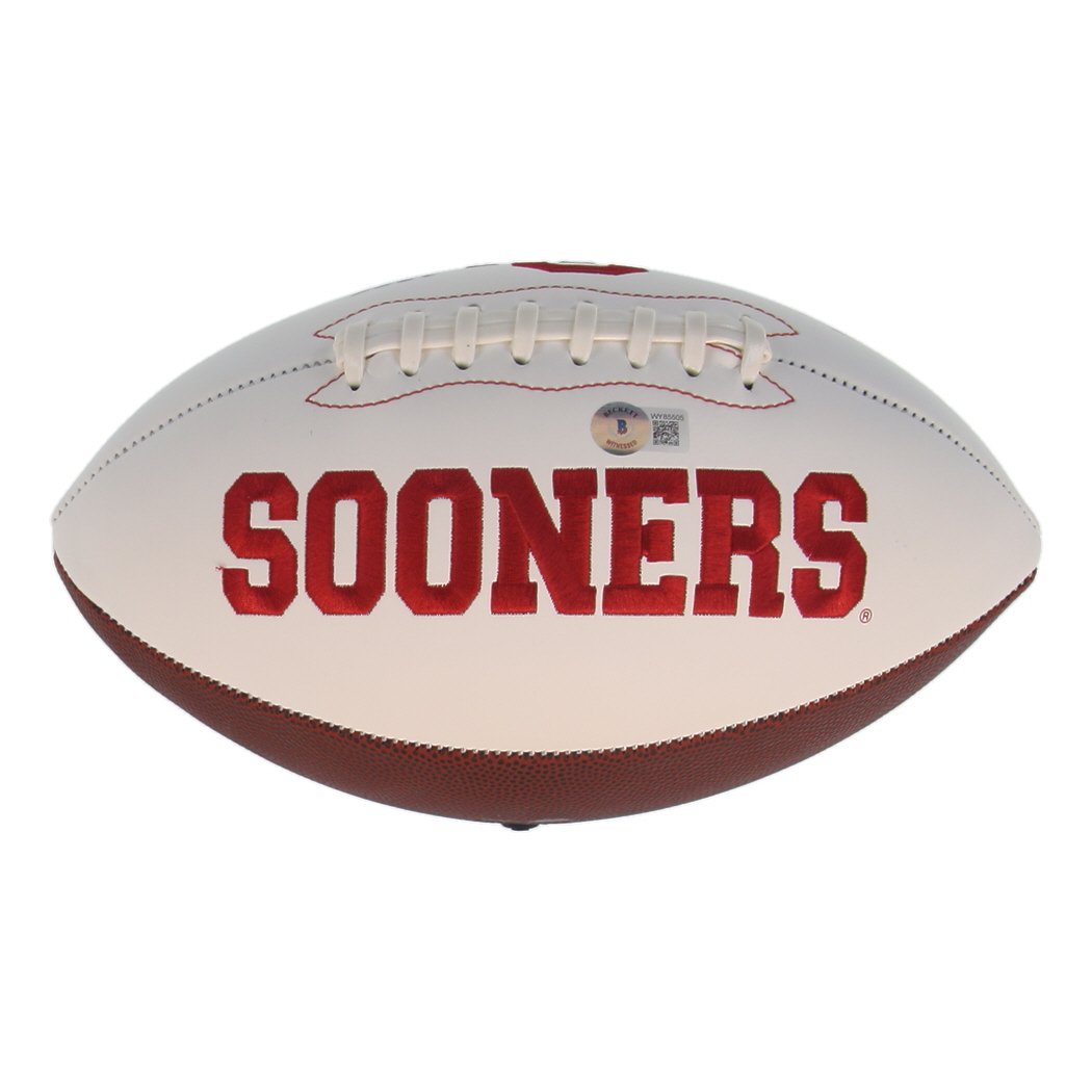 Oklahoma Sooners logo football. Hand-signed and inscribed by Adrian Peterson.