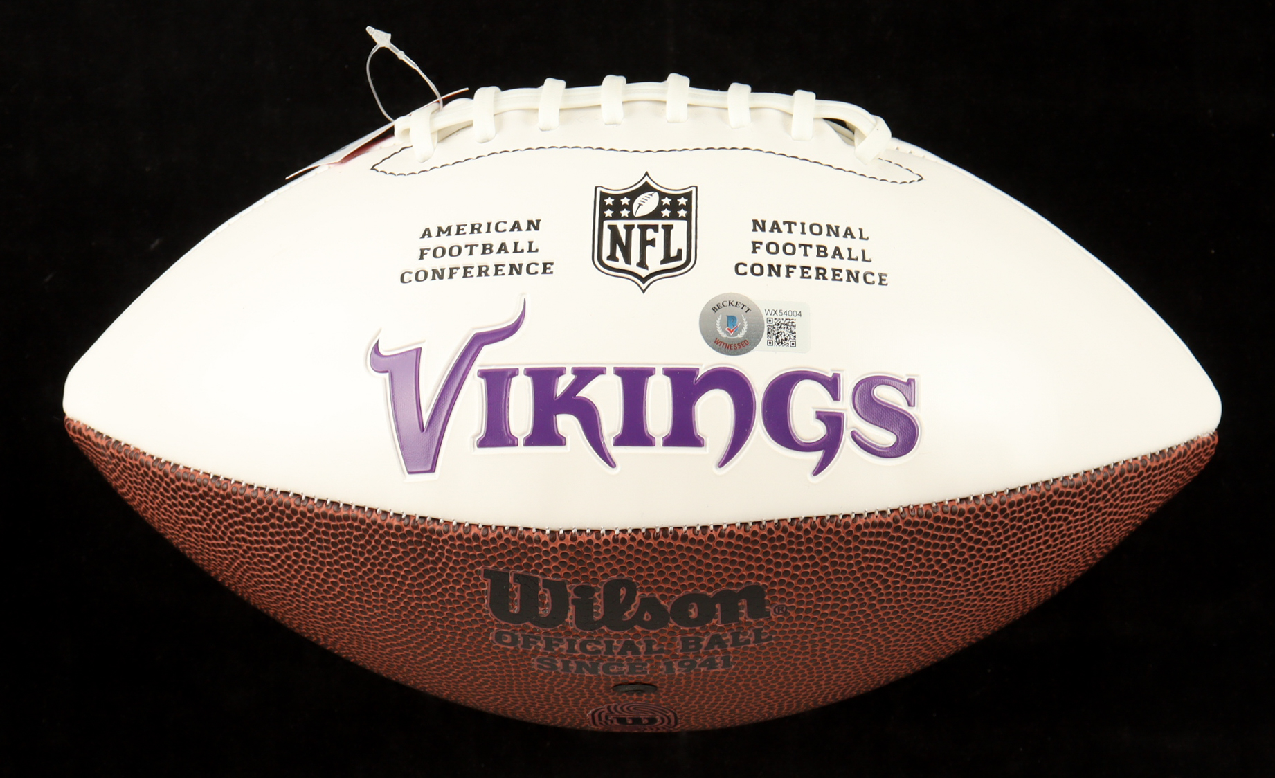 Minnesota Vikings logo football has been hand-signed by Randall Cunningham (HOF) and Daunte Culpepper.