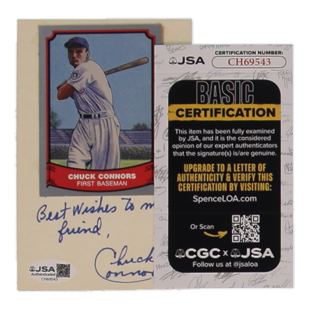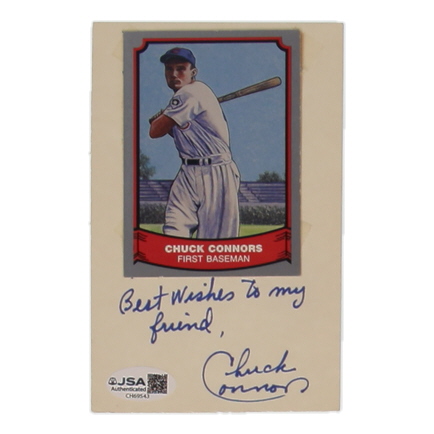Index card measures 3" x 5" in size and has been hand-signed and inscribed by Chuck Connors (D. 1992, Brooklyn Dodgers). Baseball card is attached to index card. Refer to photos for more details.
