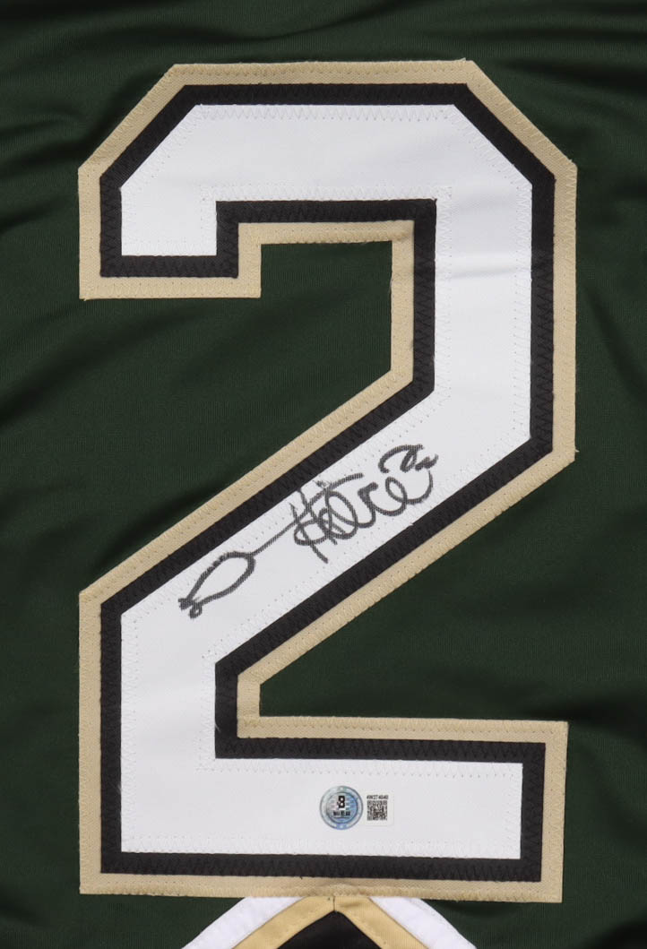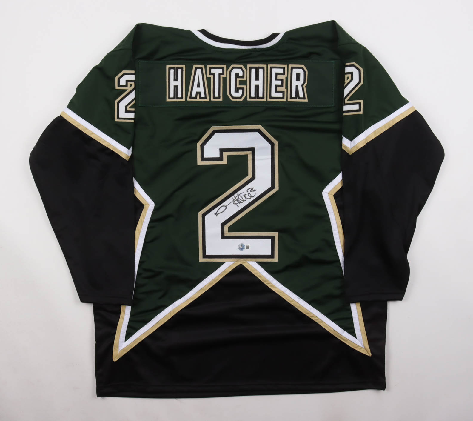 Custom jersey with everything sewn on, size XL. Hand-signed by Derian Hatcher.