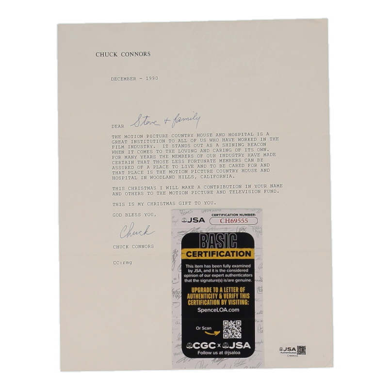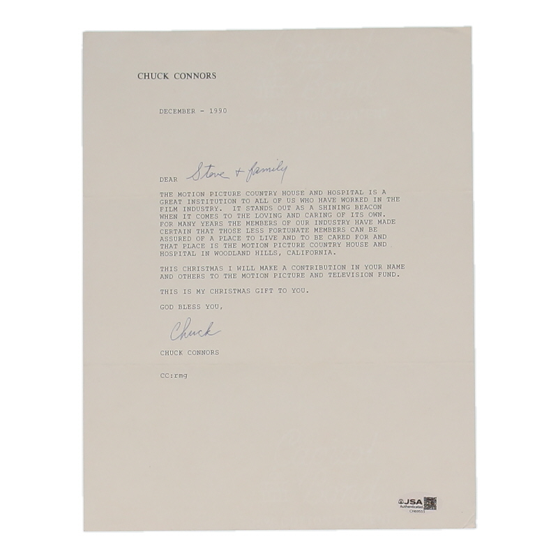 Letter measures 8" x 10" in size and has been hand-signed and inscribed by Chuck Connors (D. 1992, Brooklyn Dodgers). Letter is made out to "Steve + Family".