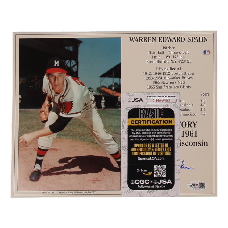 Photo measures 8" x 10" in size and has been hand-signed by Warren Spahn (D. 2003, Milwaukee Braves, HOF).