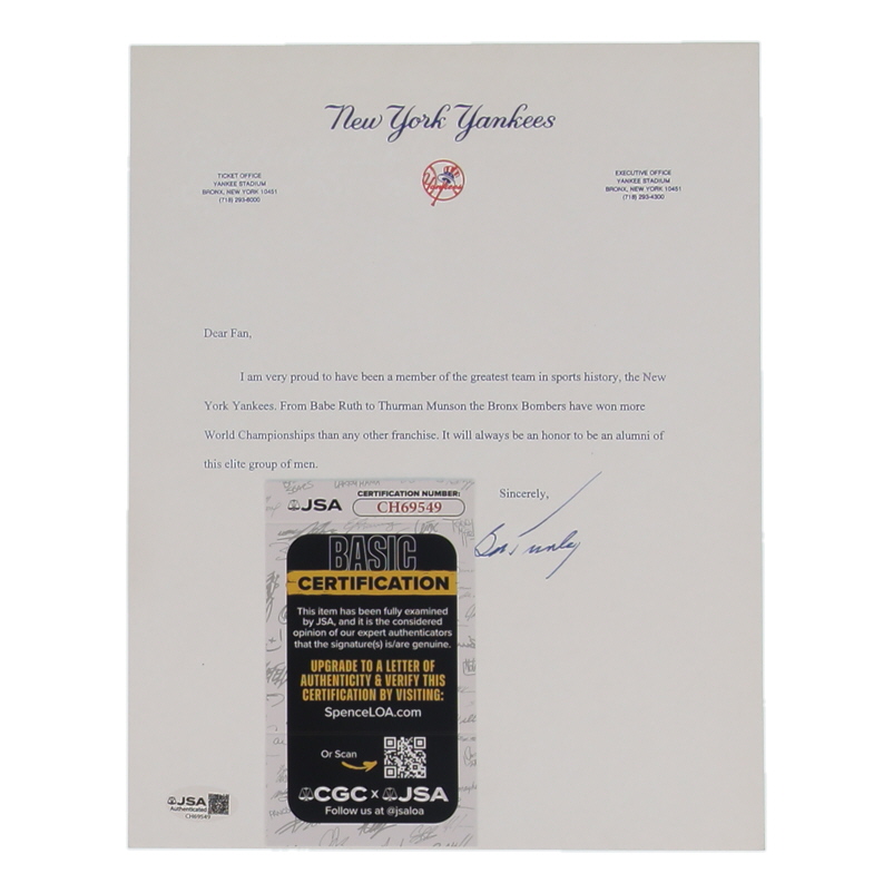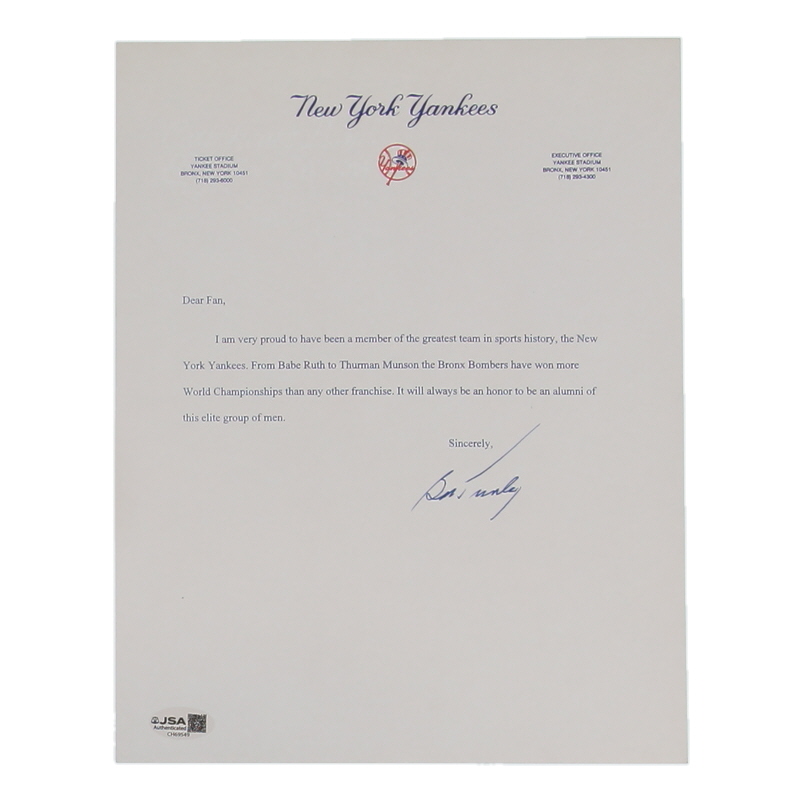 Letter has been hand-signed by Bob Turley (D. 2013, New York Yankees).