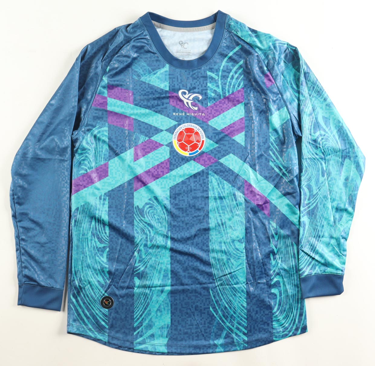 Higuita jersey with everything printed on, size L. Hand-signed by Rene Higuita.