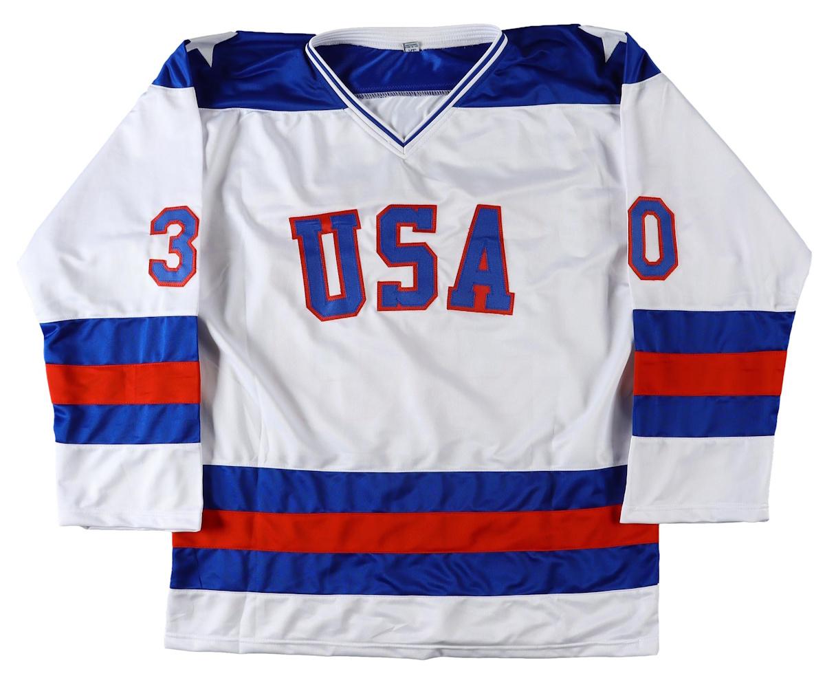 Custom jersey with everything sewn on, size XL. Hand-signed by Jim Craig.