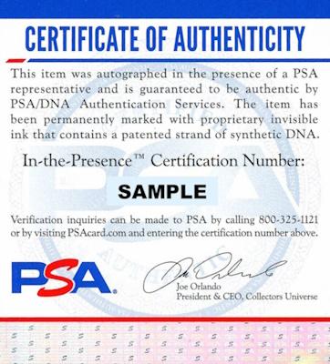 The autograph includes an official PSA/DNA Authentication Services serially numbered hologram and matching COA for authenticity purposes.