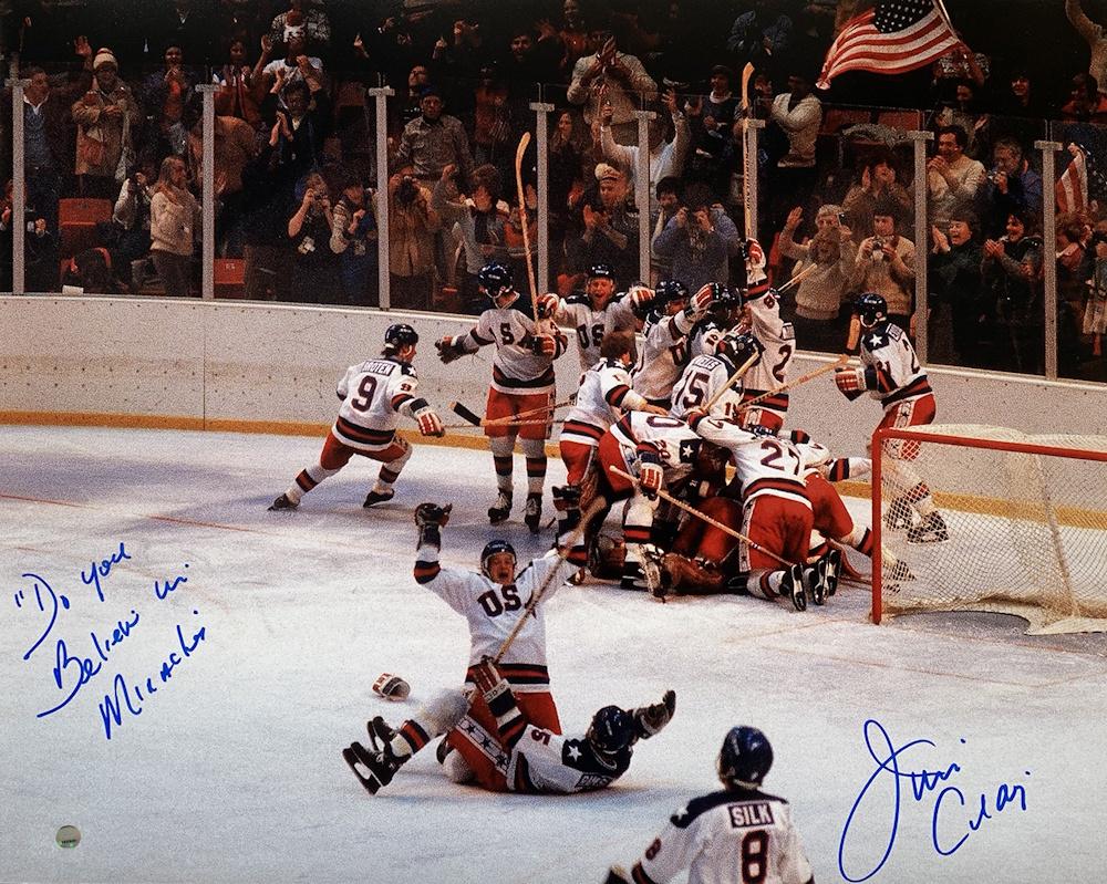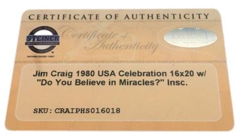 Photo measures approximately 16" x 20" in size. Hand-signed by Jim Craig (Team USA).