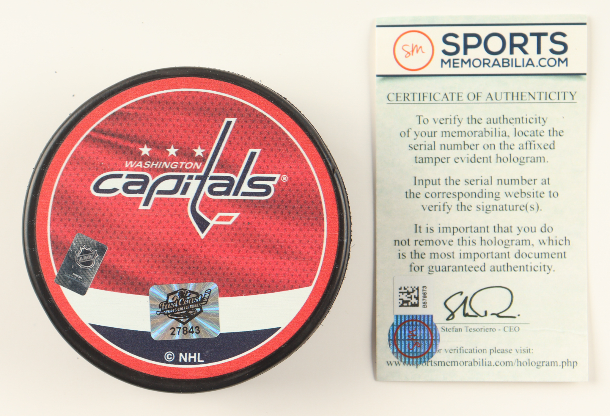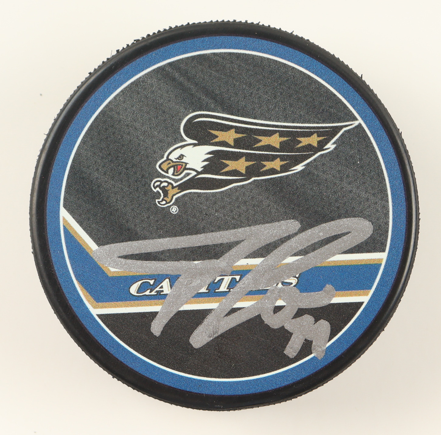 Washington Capitals logo hockey puck has been hand-signed by John Carlson.