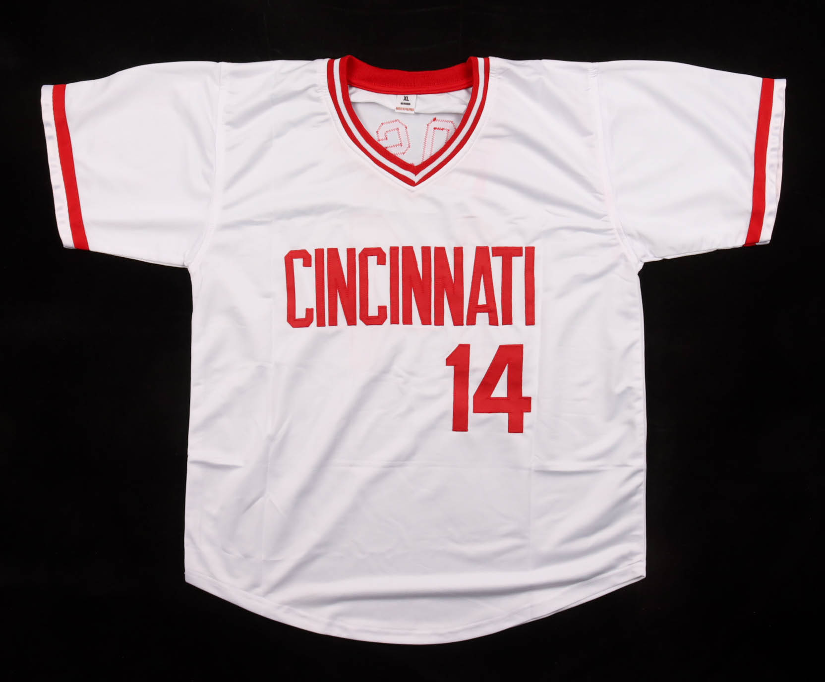 Custom jersey with everything sewn on, size XL. Hand-signed by Pete Rose (D. 2024). Please note, there is staining on the back of the jersey. See photos regarding the condition of the item.