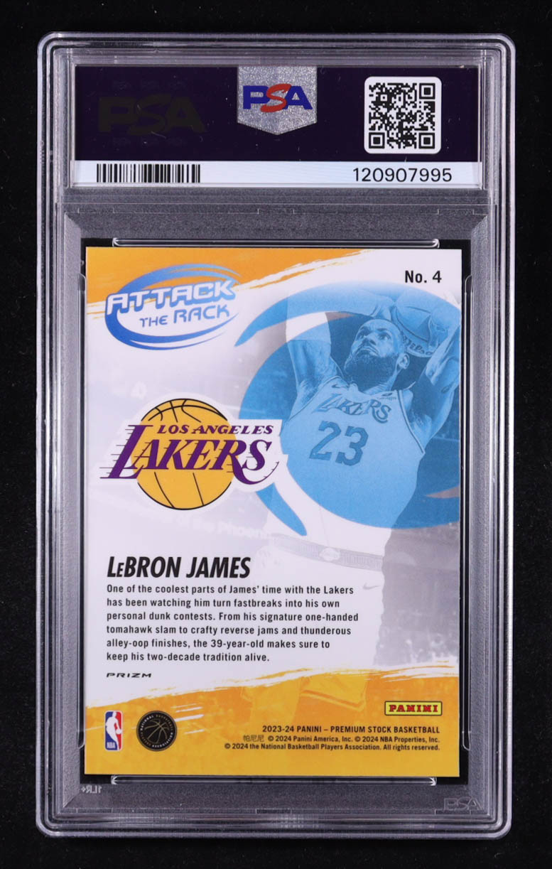 LeBron James 2023-24 Hoops Premium Stock Attack the Rack Silver Prizm #4 (PSA 9)