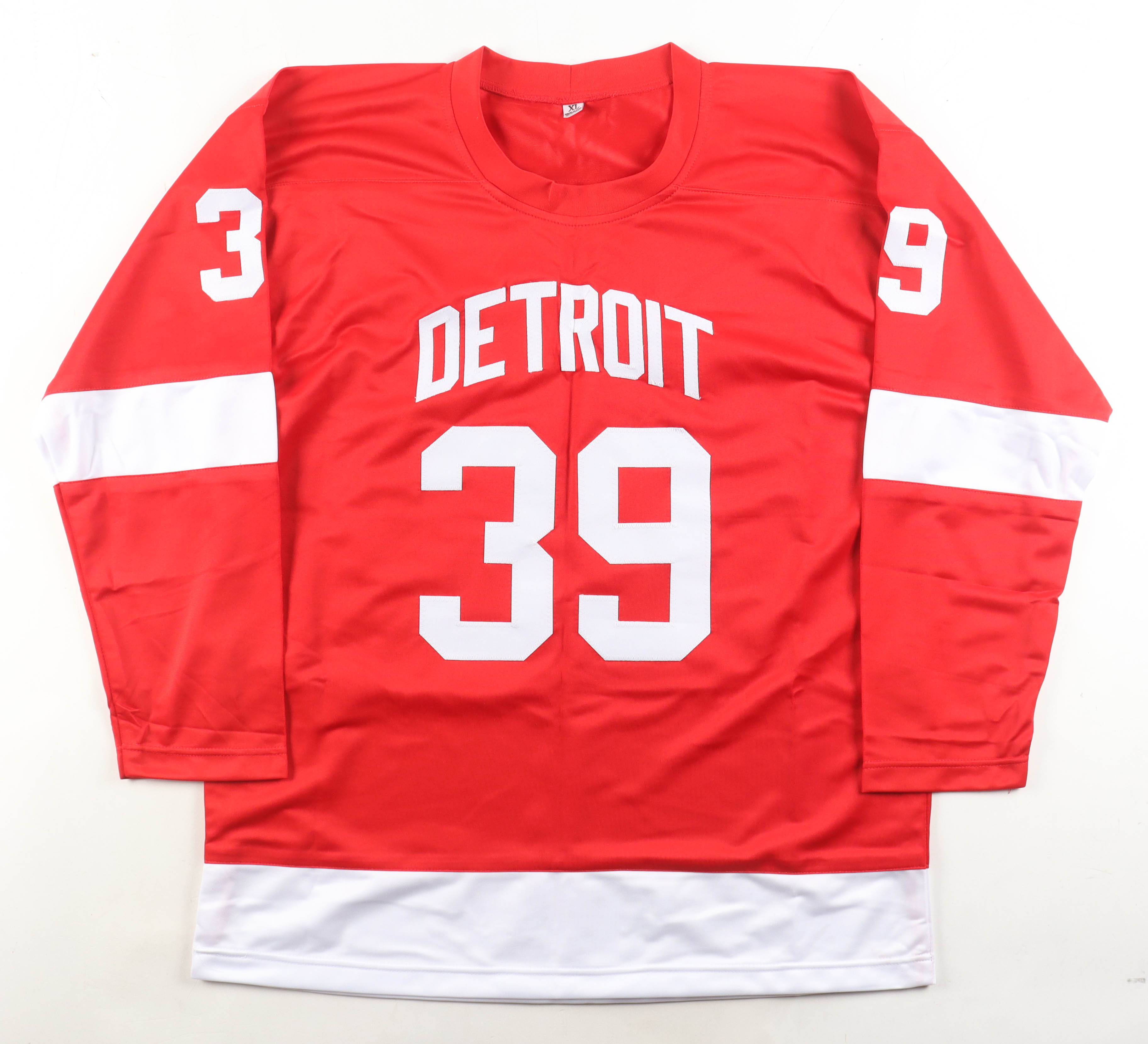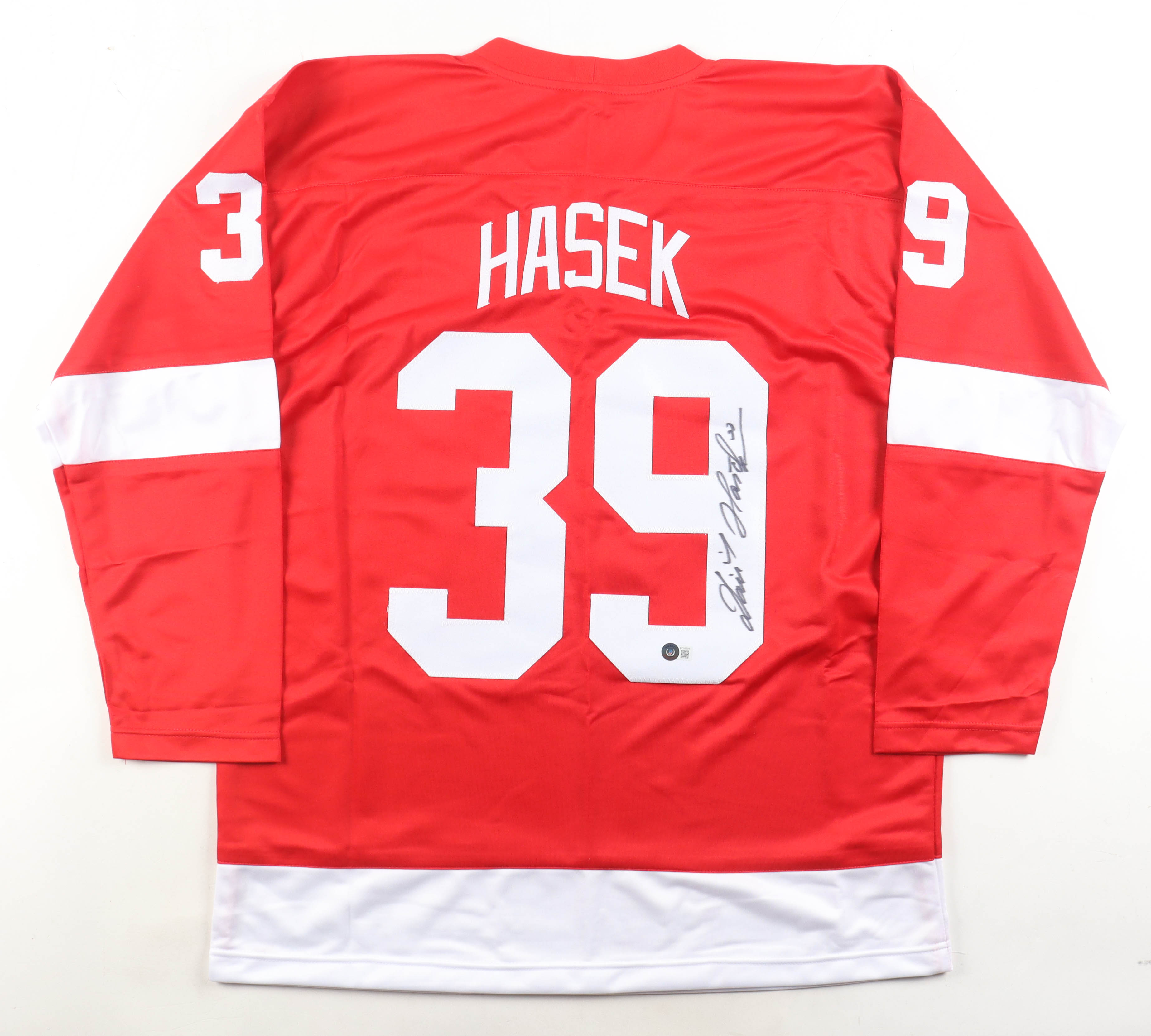 Custom jersey with everything sewn on, size XL. Hand-signed by Dominik Hasek (HOF).