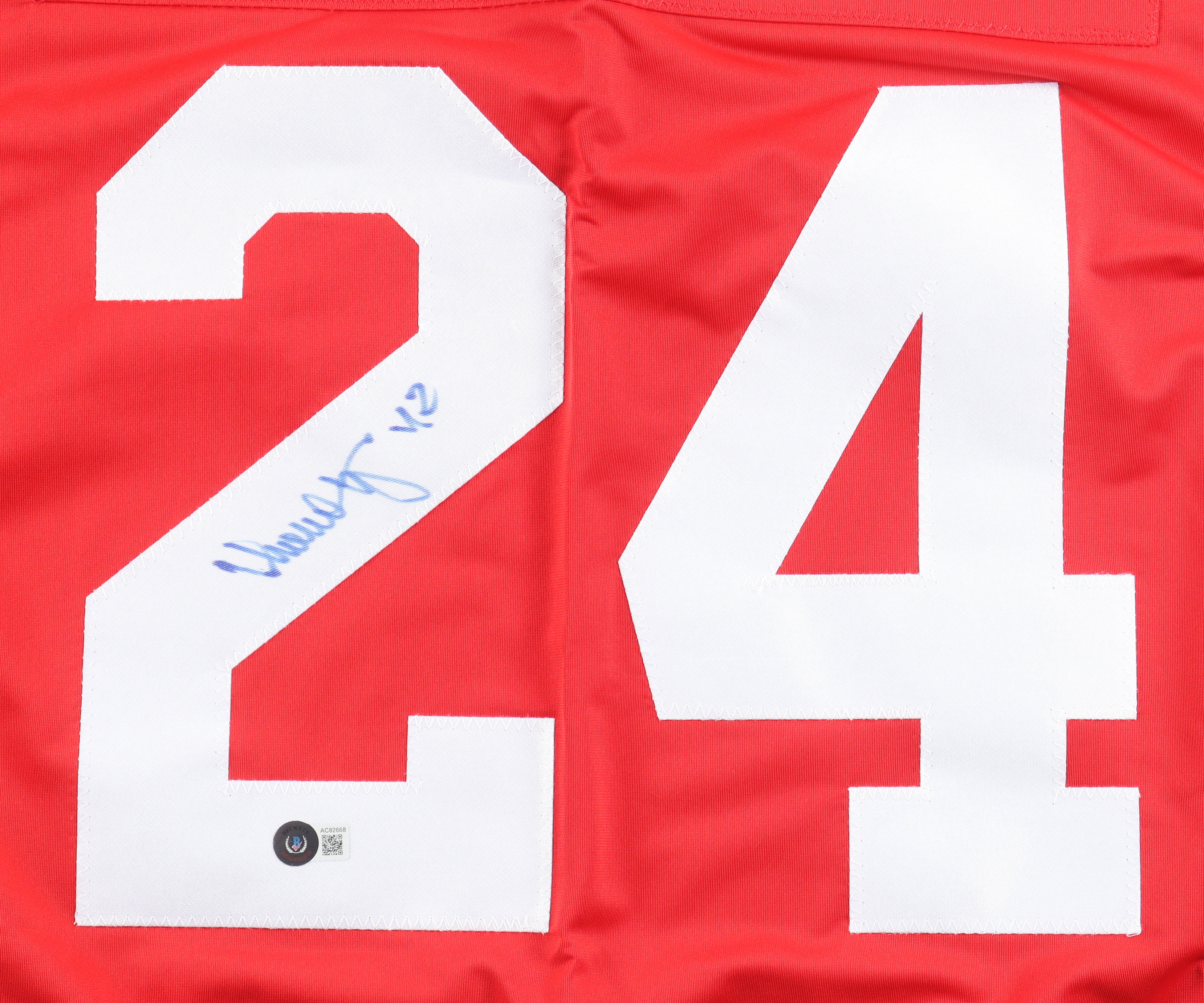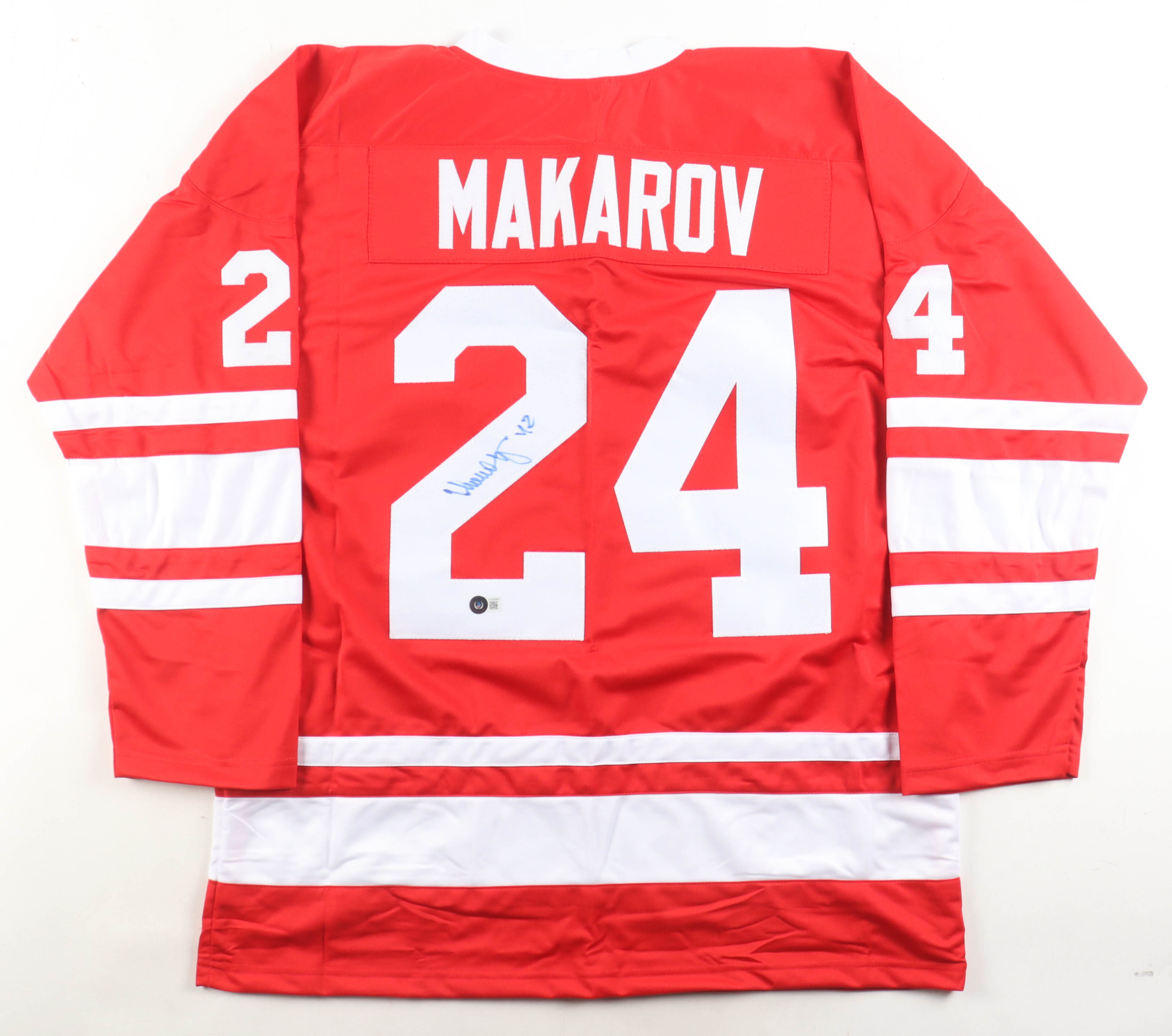 Custom jersey with everything sewn on, size XL. Hand-signed by Sergei Makarov (HOF).