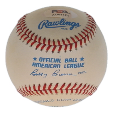 Rawlings Official American League Baseball. Hand-signed by Bobby Doerr (D. 2017, Boston Red Sox, HOF). Please note, the baseball is stained and naturally toned.