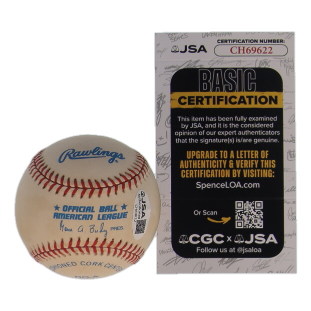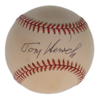 Rawlings Official American League Baseball. Hand-signed by Tommy Henrich (D. 2009, New York Yankees). Please note, the baseball is naturally toned and stained throughout.