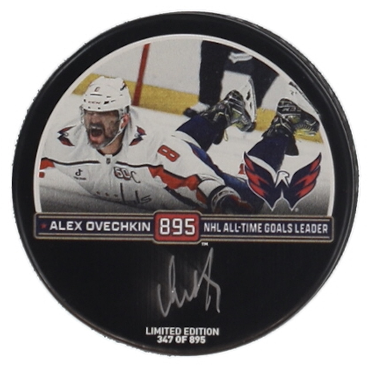 Washington Capitals logo commemorative hockey puck. Hand-signed by Alexander Ovechkin. Limited edition #347/895