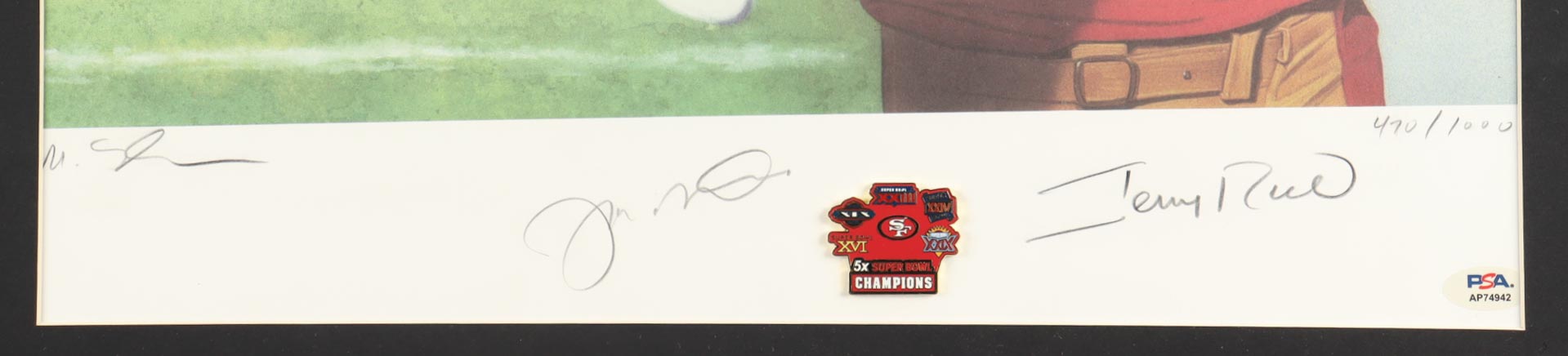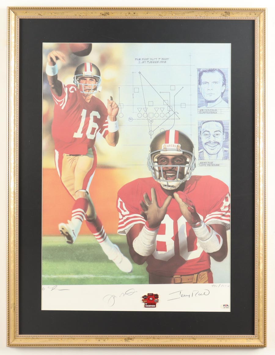 Custom frame measures 23" x 30" in size and features an art print that has been hand-signed by Joe Montana (HOF) and Jerry Rice (HOF). Please note that the item has been labeled limited edition # 470 / 1000.
